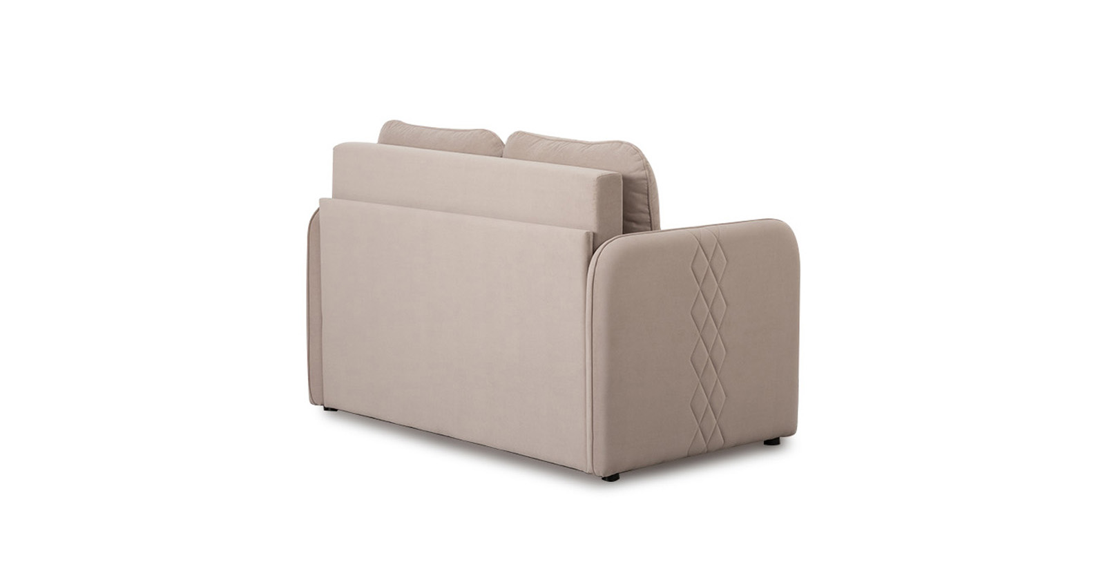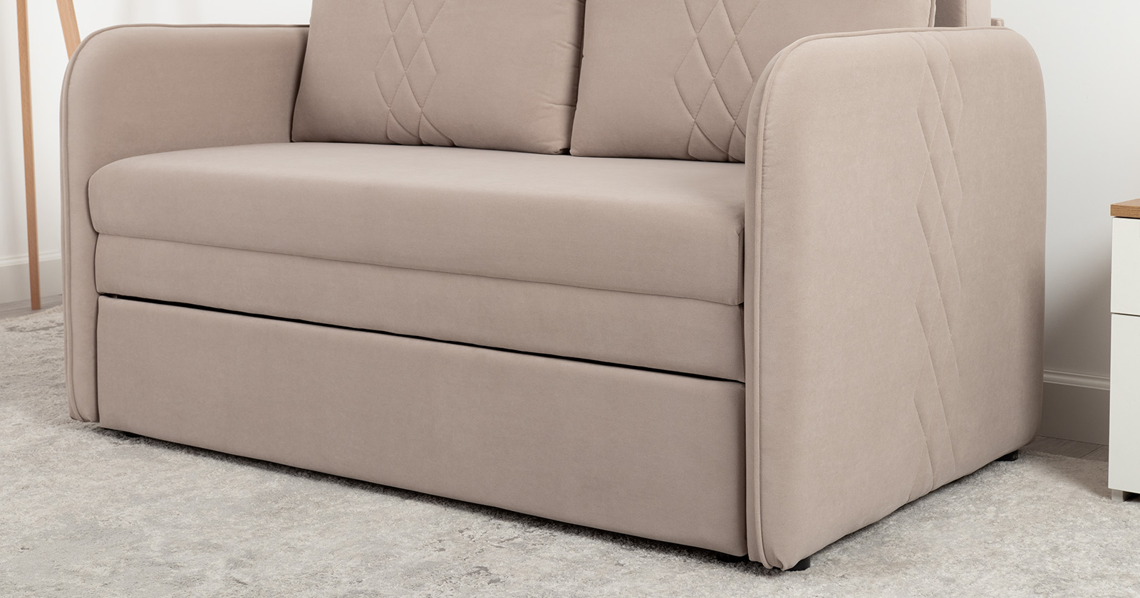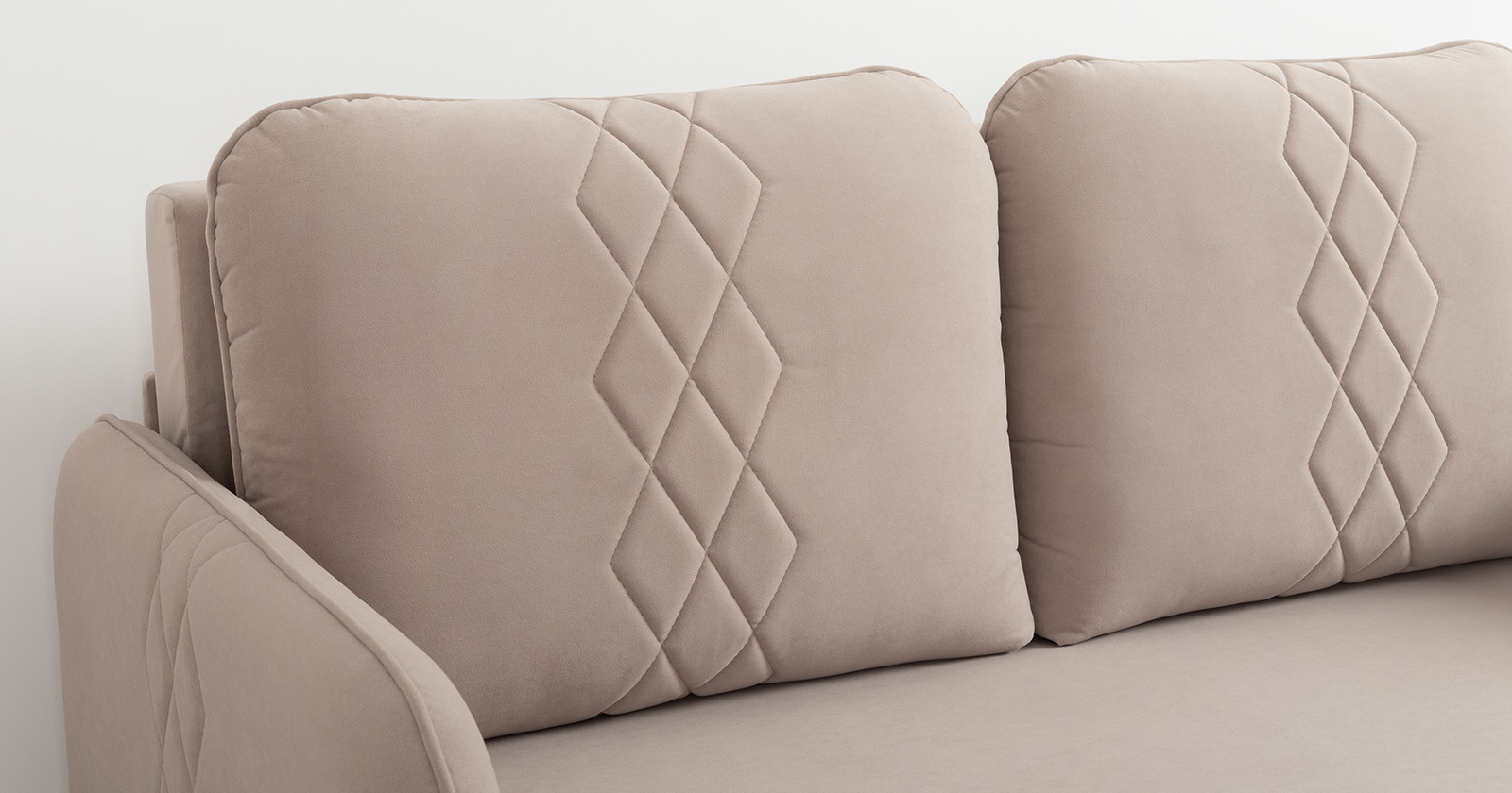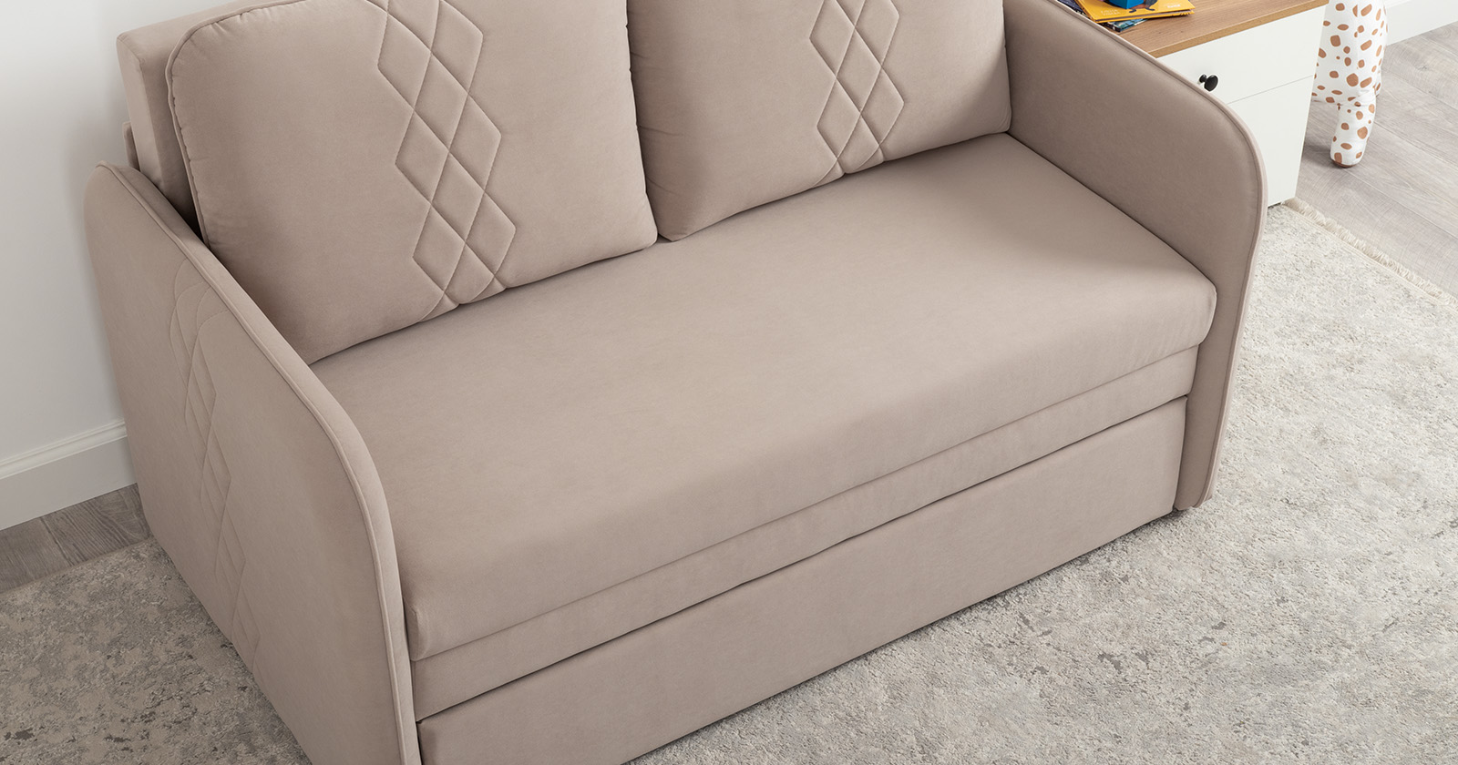 Стильный компактный диван для детской и гостиной. При своих скромных размерах он трансформируется в полноценное спальное место для детей и подростков. Лаконичный дизайн в виде декоративной стежки подчеркивает фактуру велюра, а небольшие размеры позволят разместить его в любом пространстве.