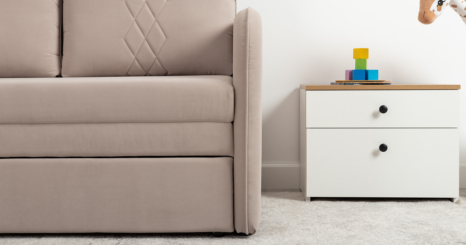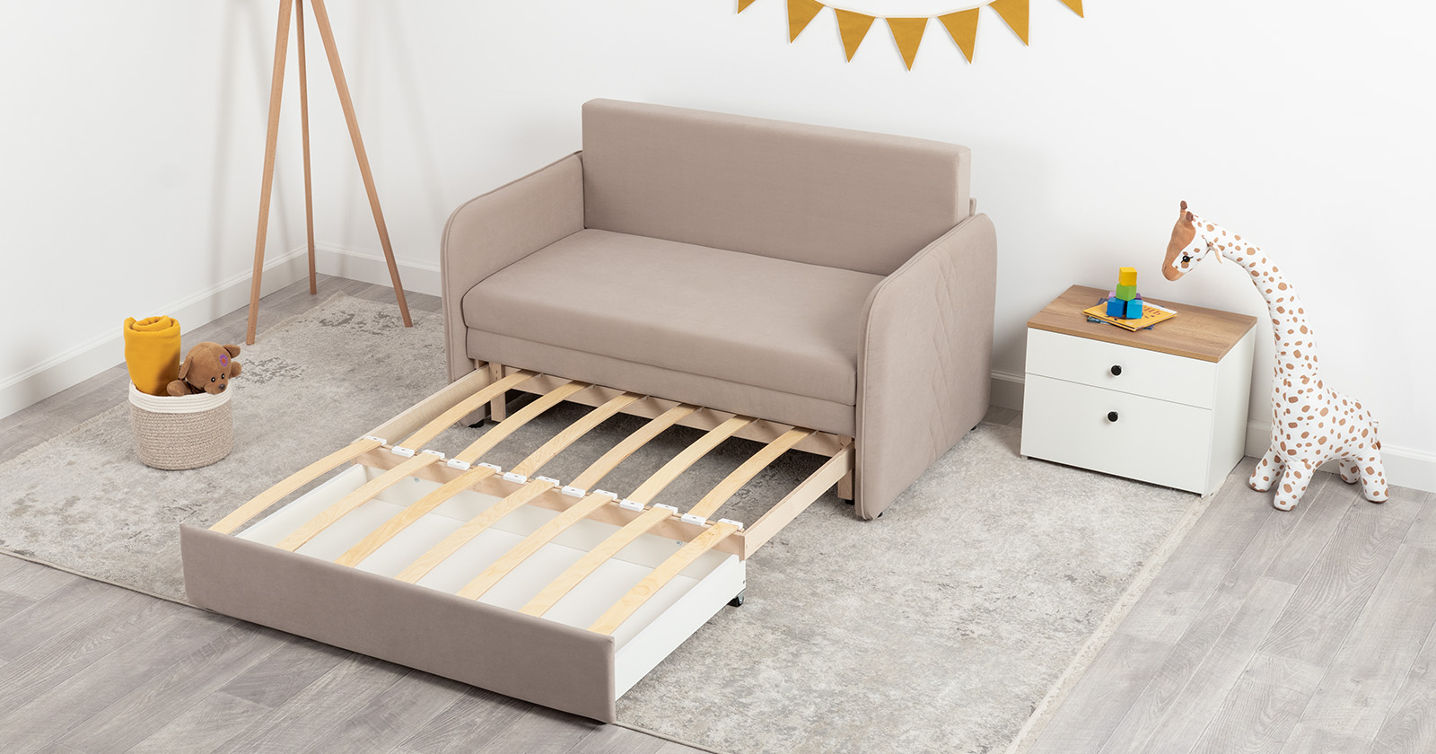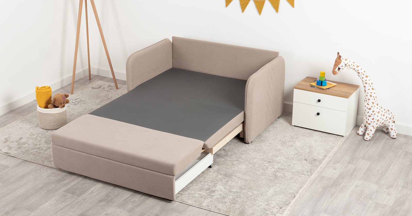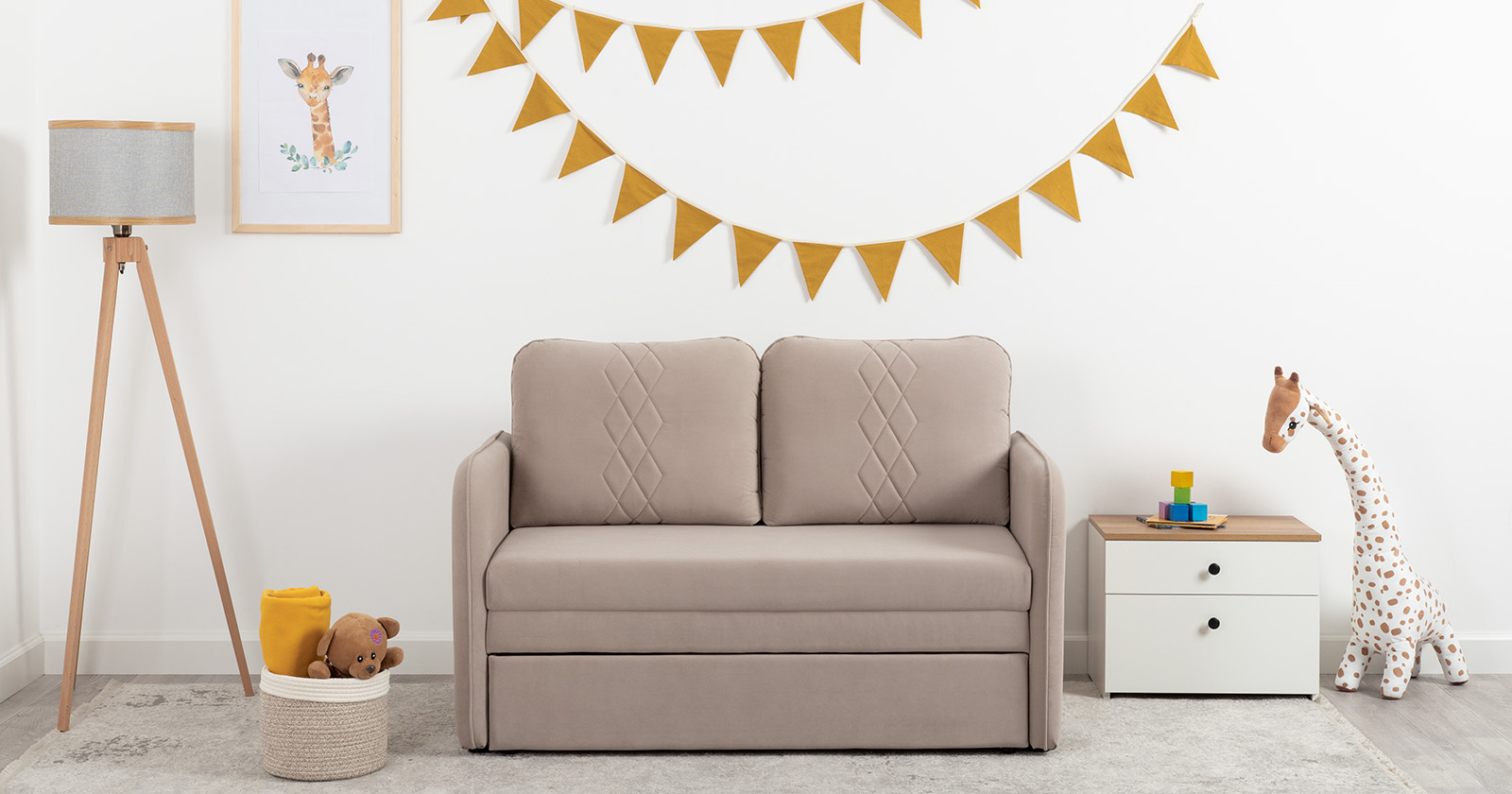 Стильный компактный диван для детской и гостиной. При своих скромных размерах он трансформируется в полноценное спальное место для детей и подростков. Лаконичный дизайн в виде декоративной стежки подчеркивает фактуру велюра, а небольшие размеры позволят разместить его в любом пространстве.