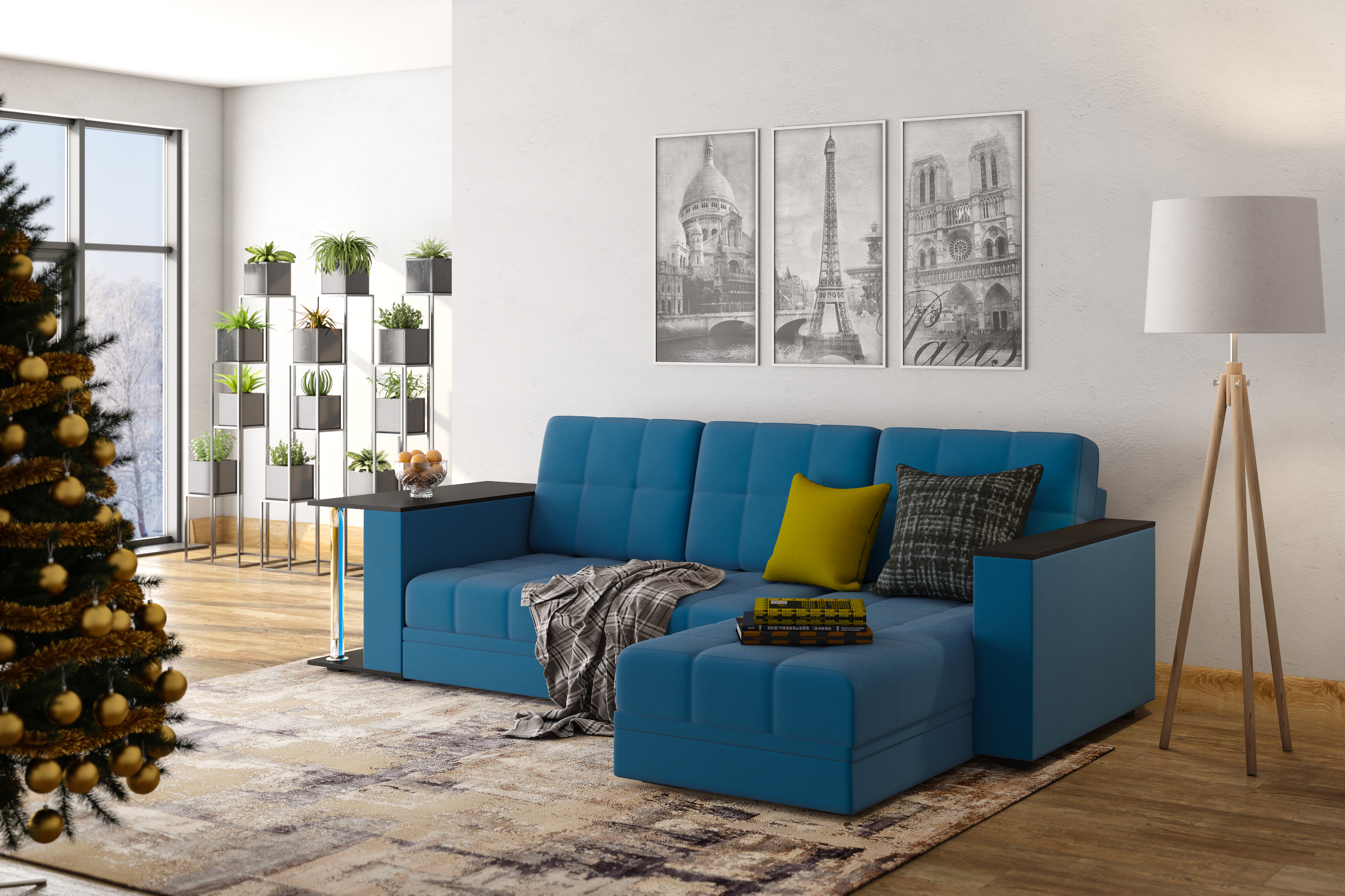 Диван-кровать угловой Атлант со столиком велюр синий со спальным местом (сборка на любую сторону)