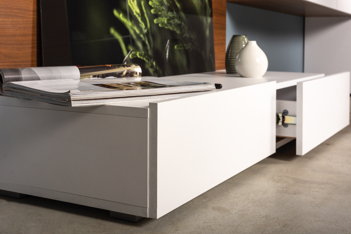 Тумба под ТВ в гостиную Квадро 13.276 белый PE шагрень, черный