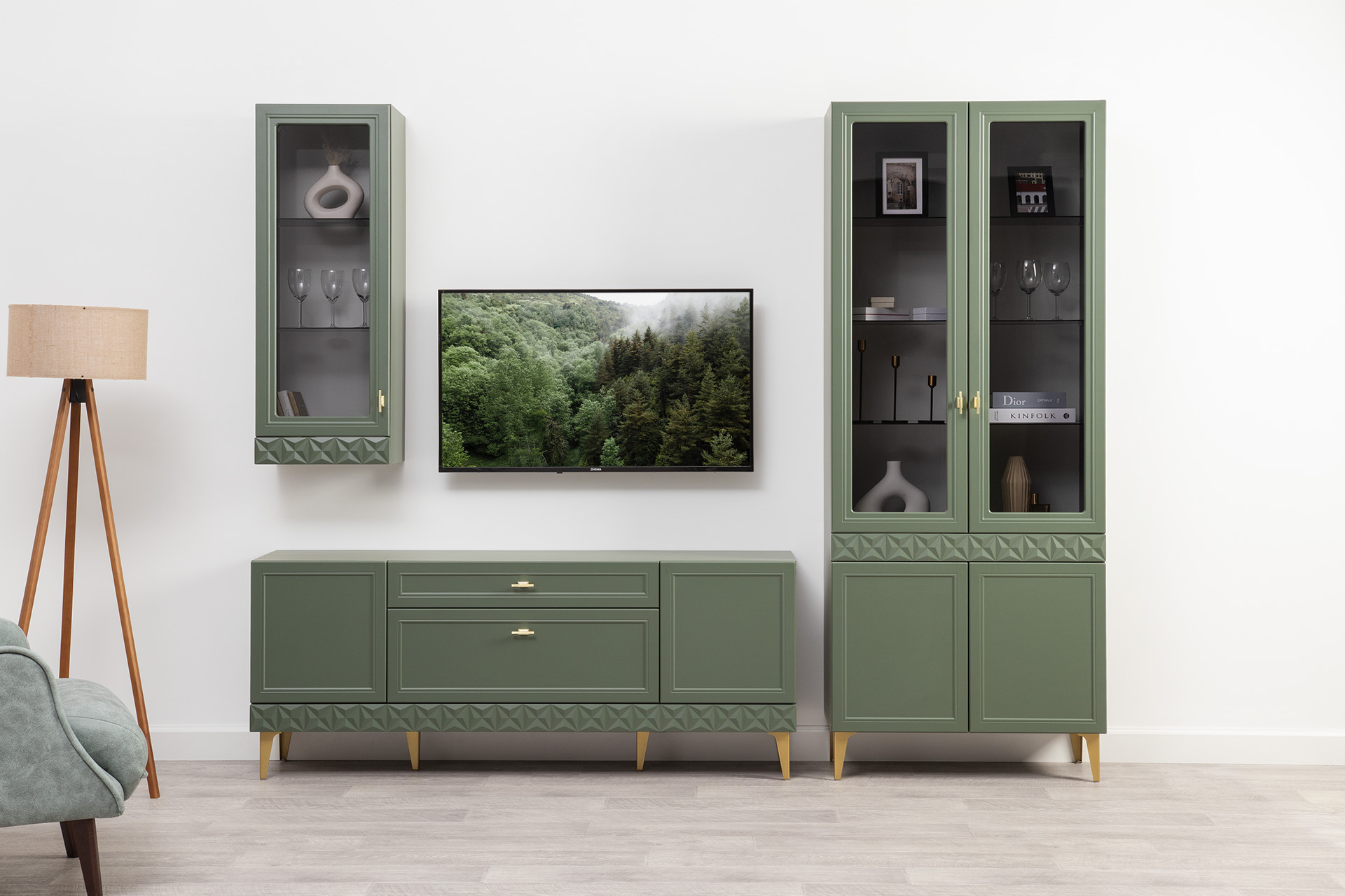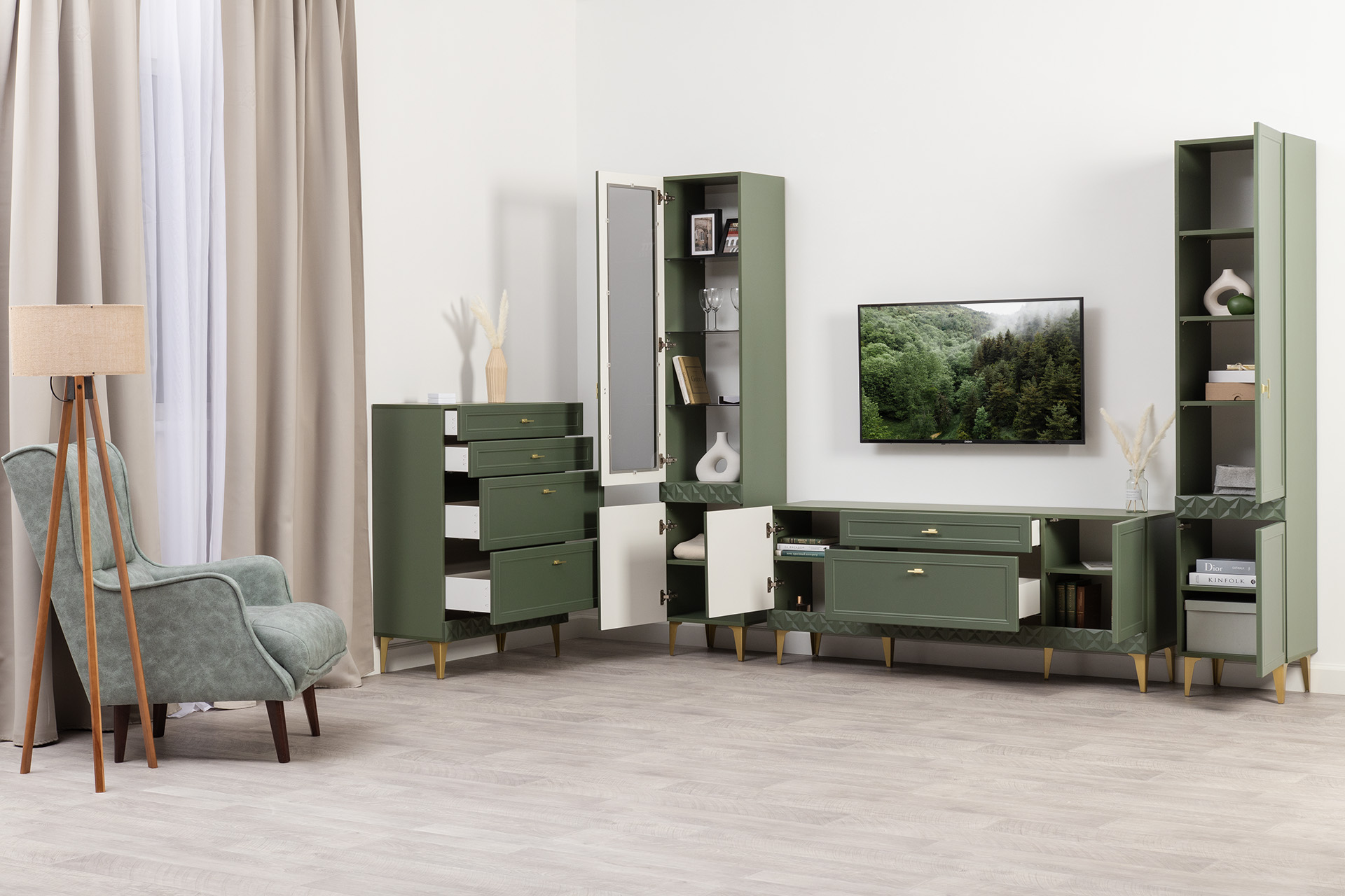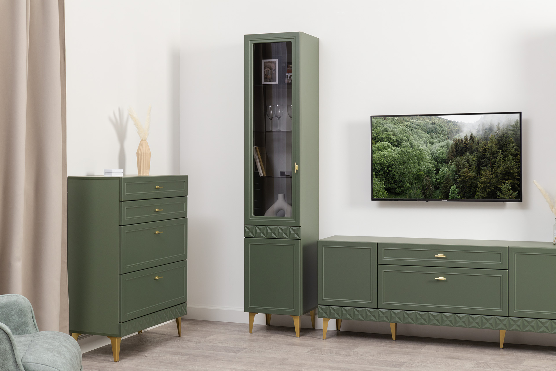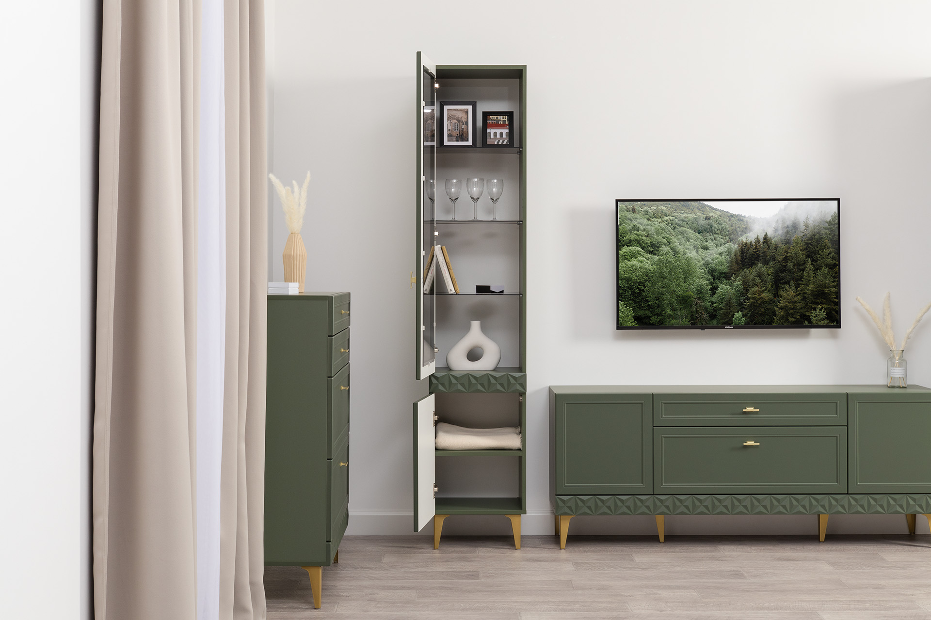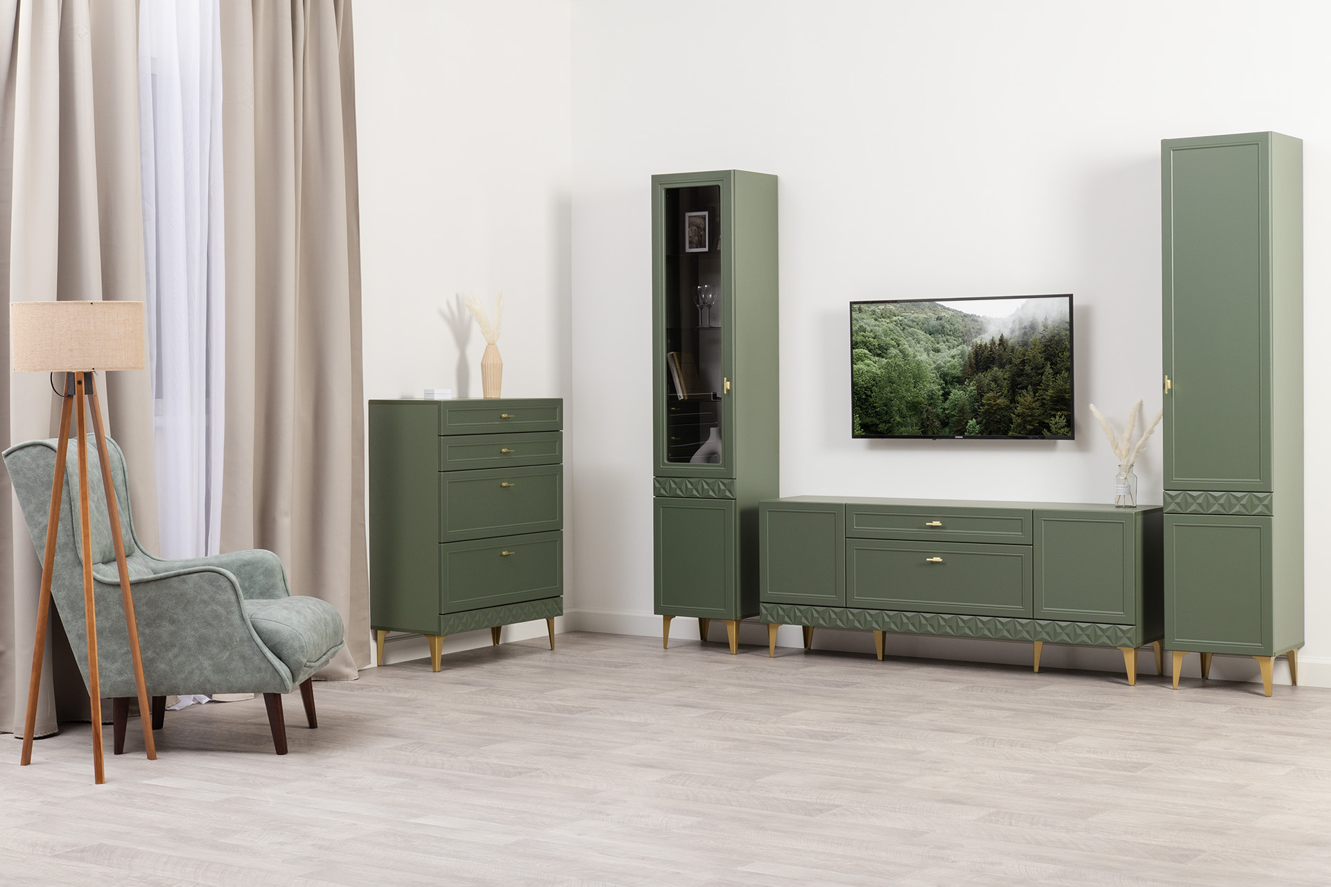 Гостиная Марион композиция 1 дымчатый зеленый K521, олива шагрень AG 1050 ПВХ, белый PE шагрень (собирается на любую сторону)