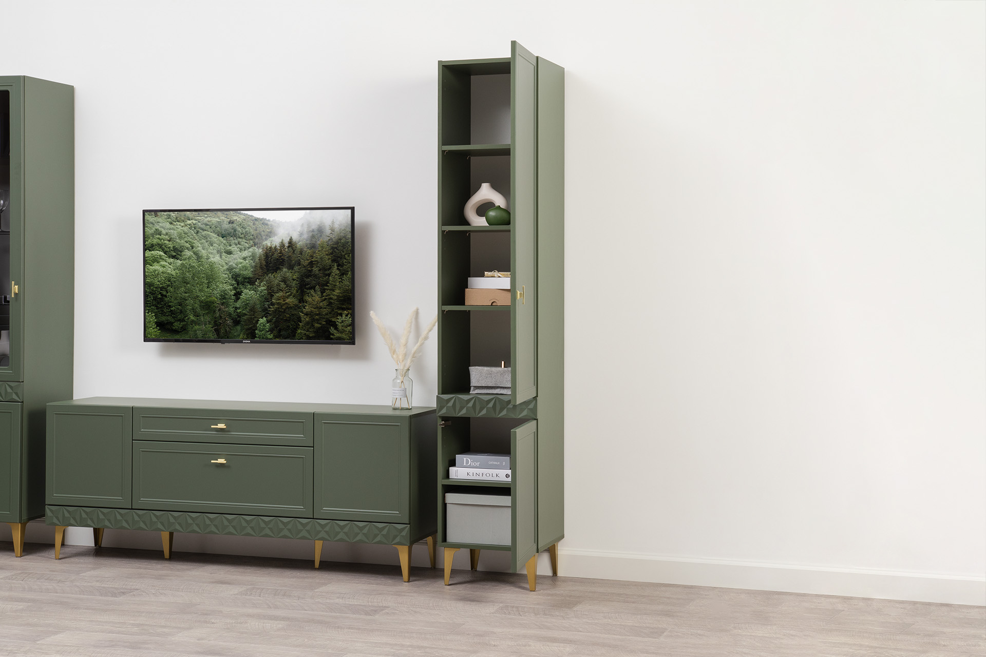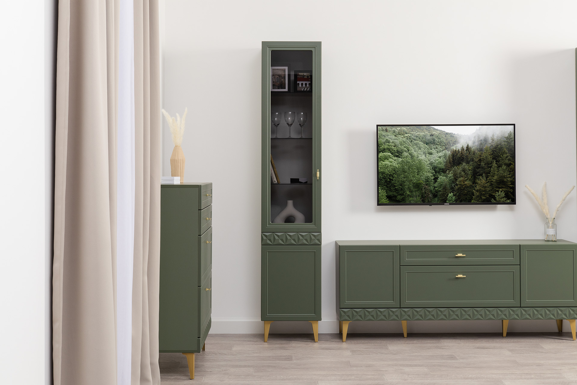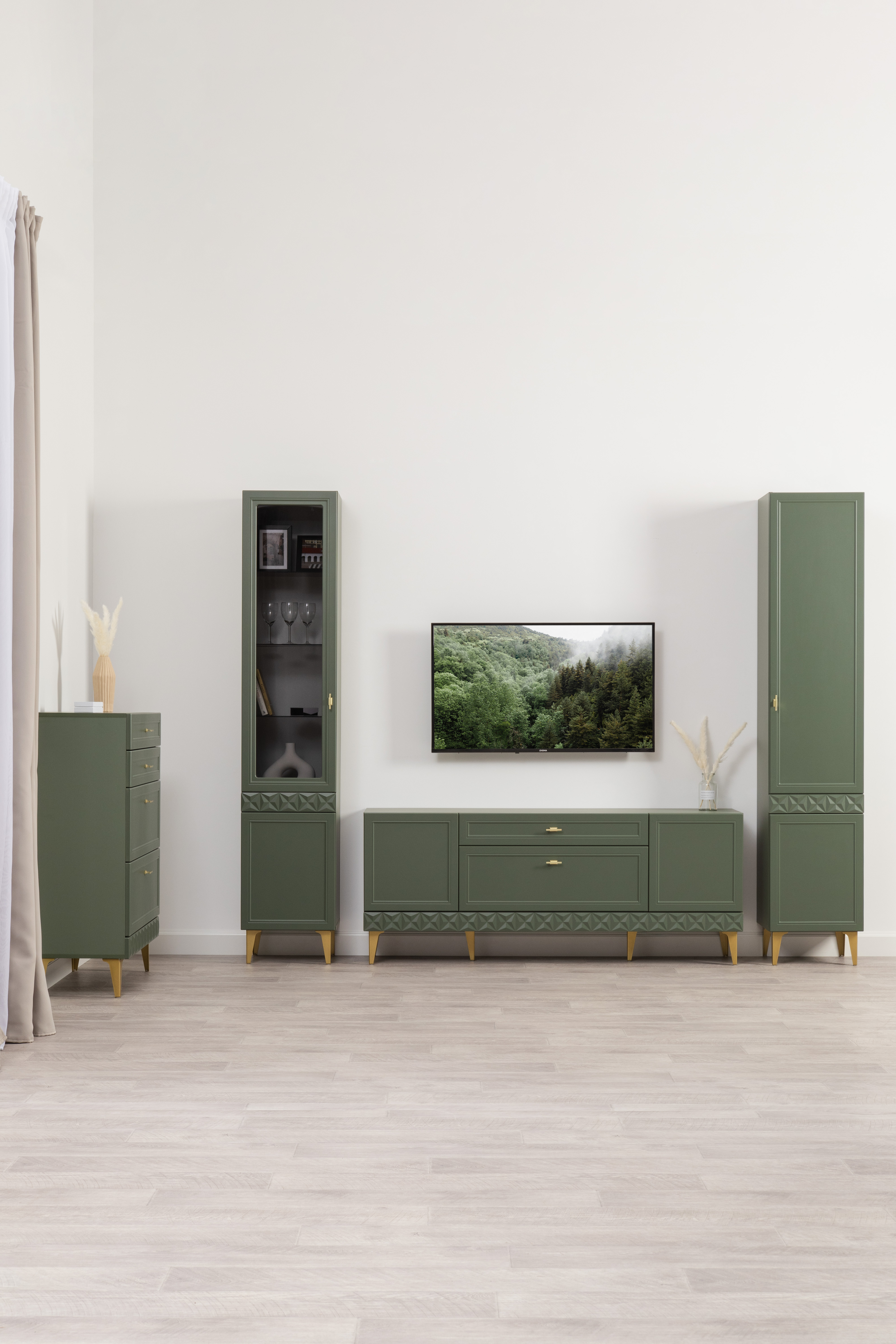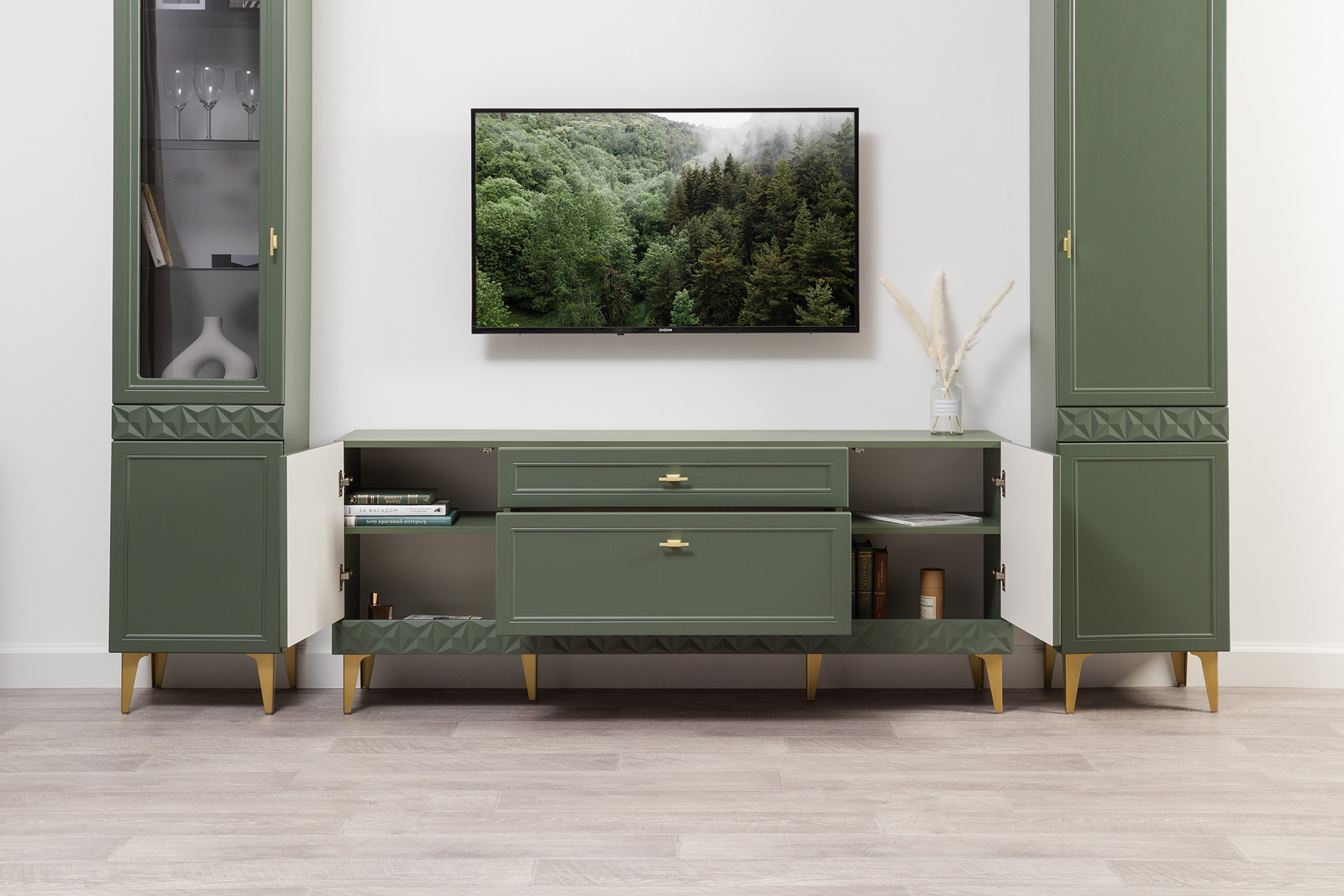 Гостиная Марион композиция 1 дымчатый зеленый K521, олива шагрень AG 1050 ПВХ, белый PE шагрень (собирается на любую сторону)