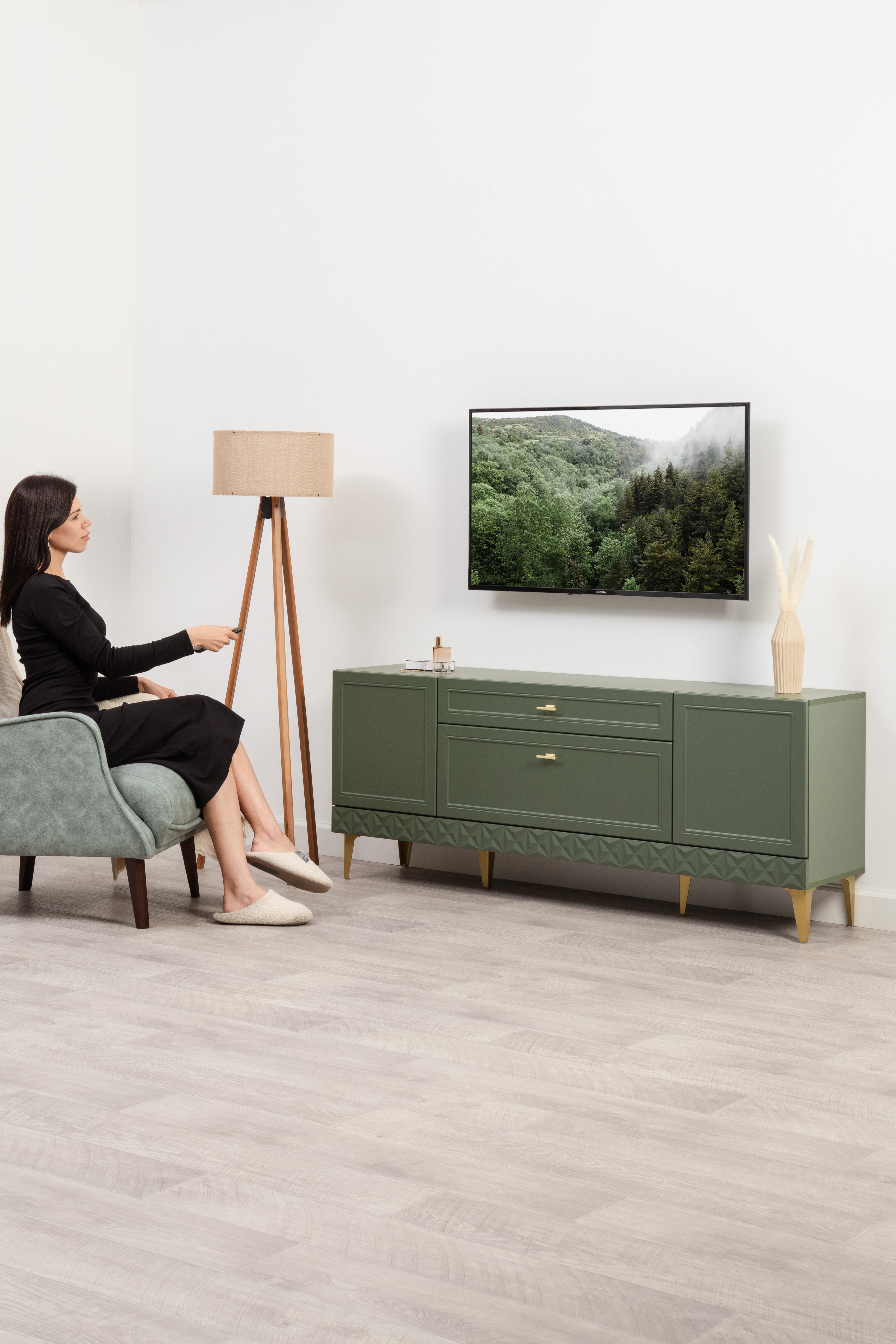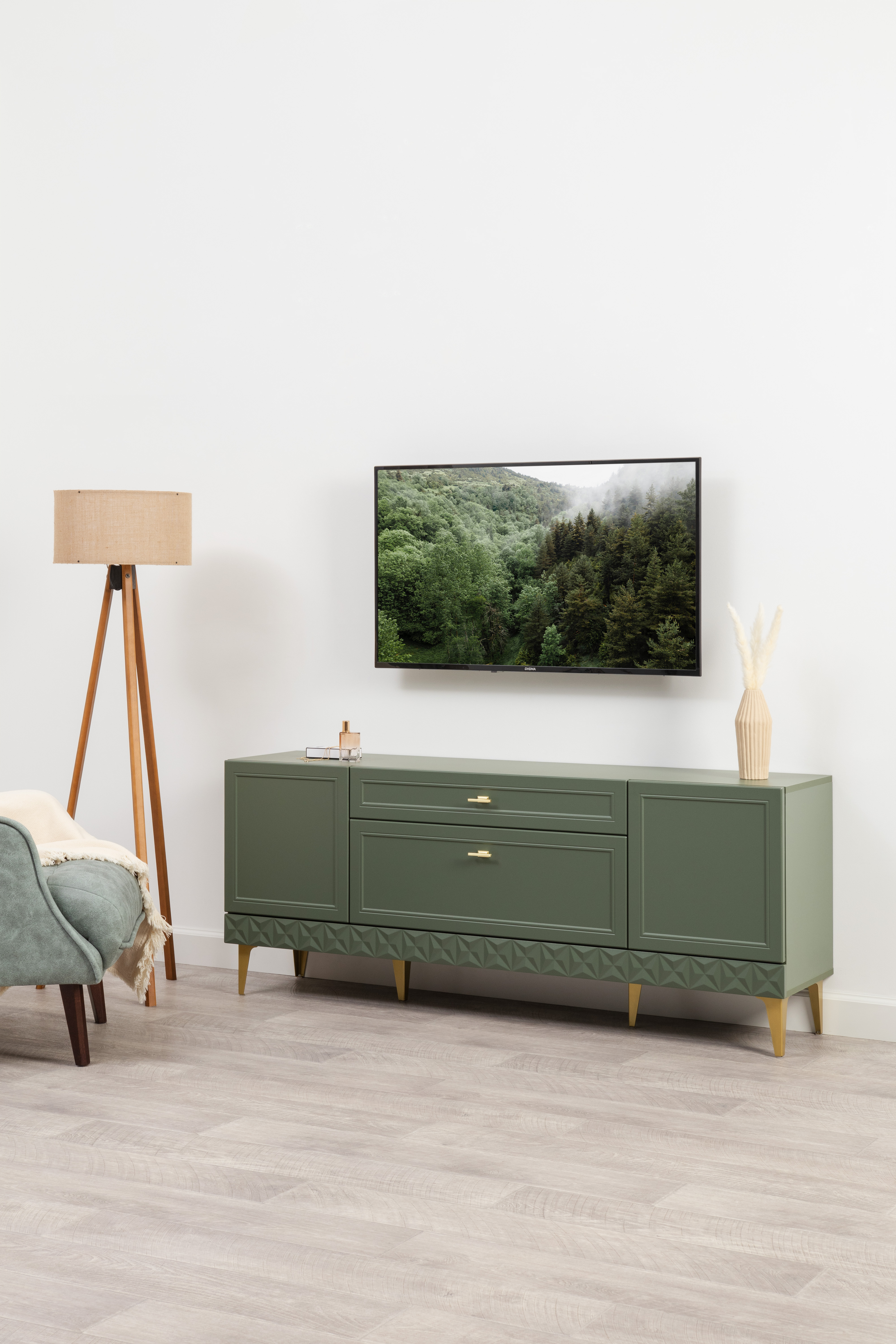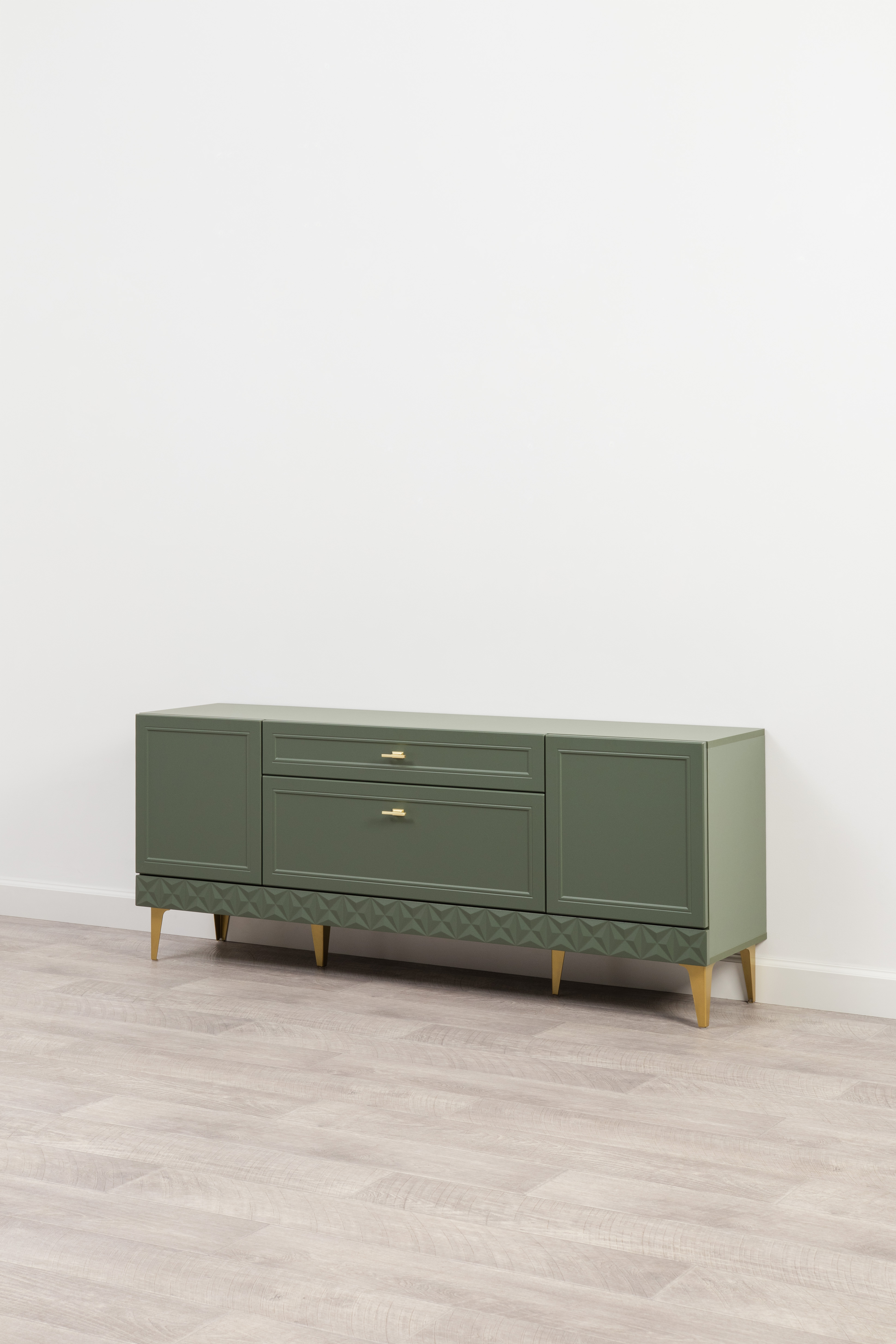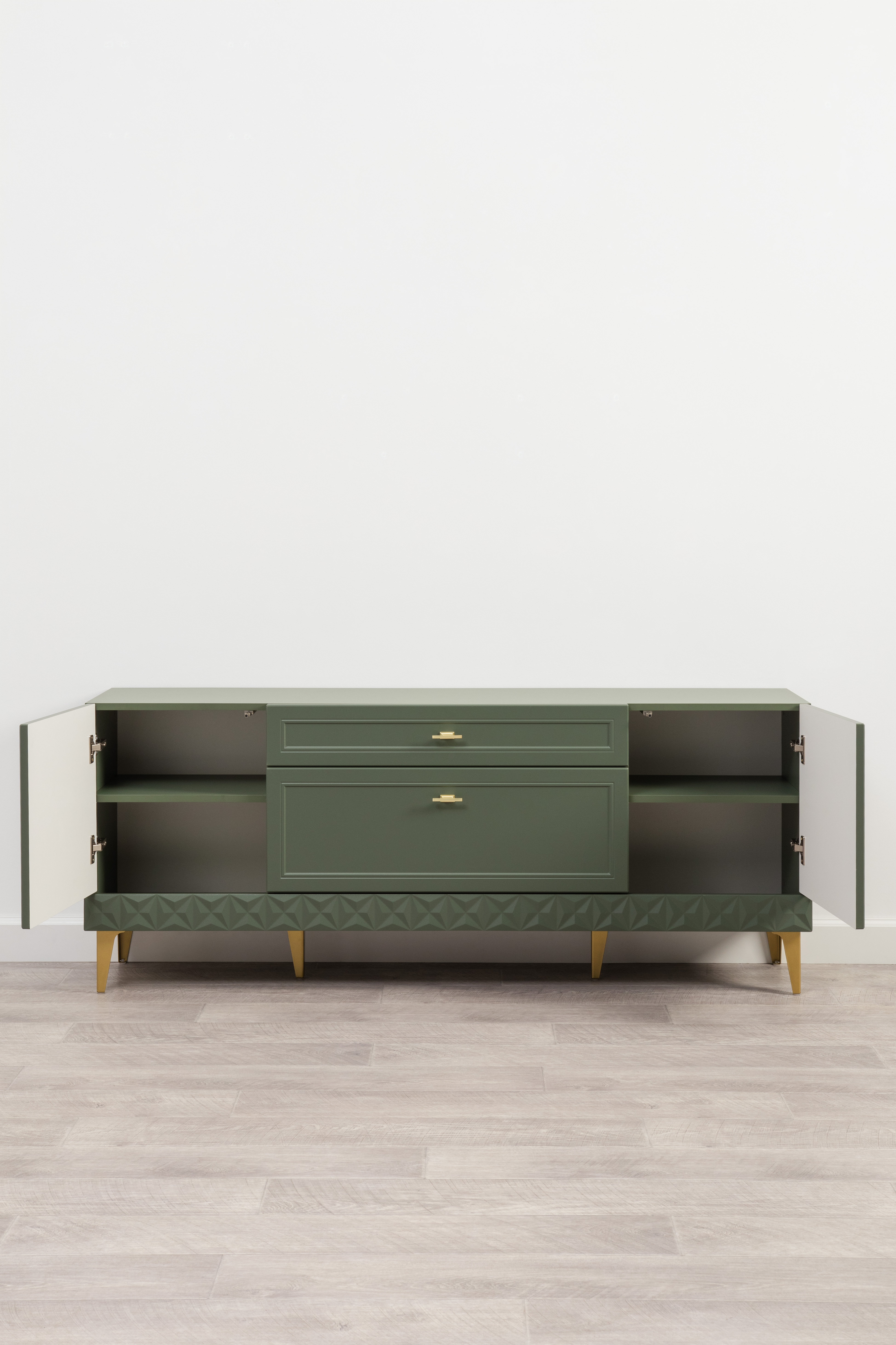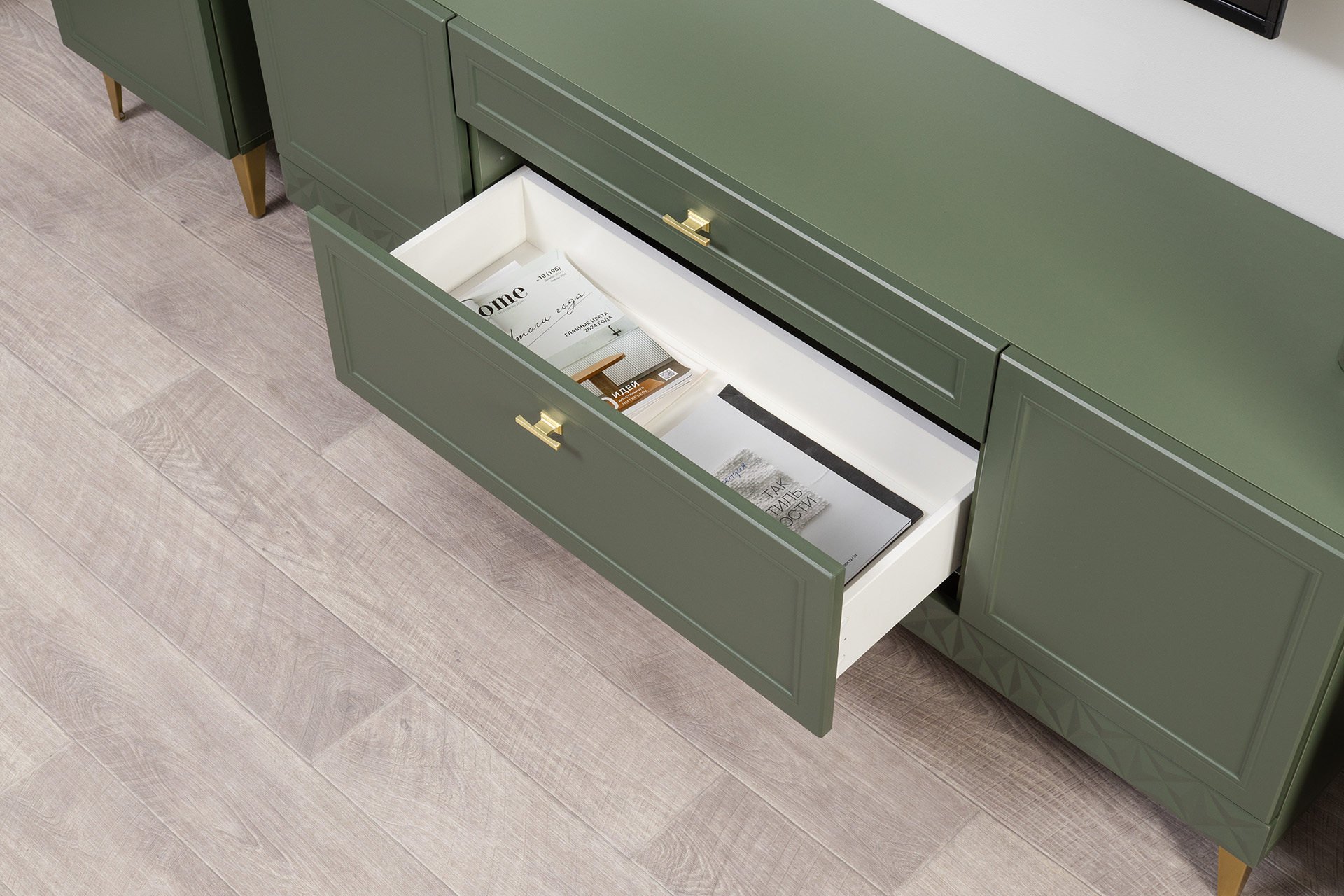 Гостиная Марион композиция 1 дымчатый зеленый K521, олива шагрень AG 1050 ПВХ, белый PE шагрень (собирается на любую сторону)