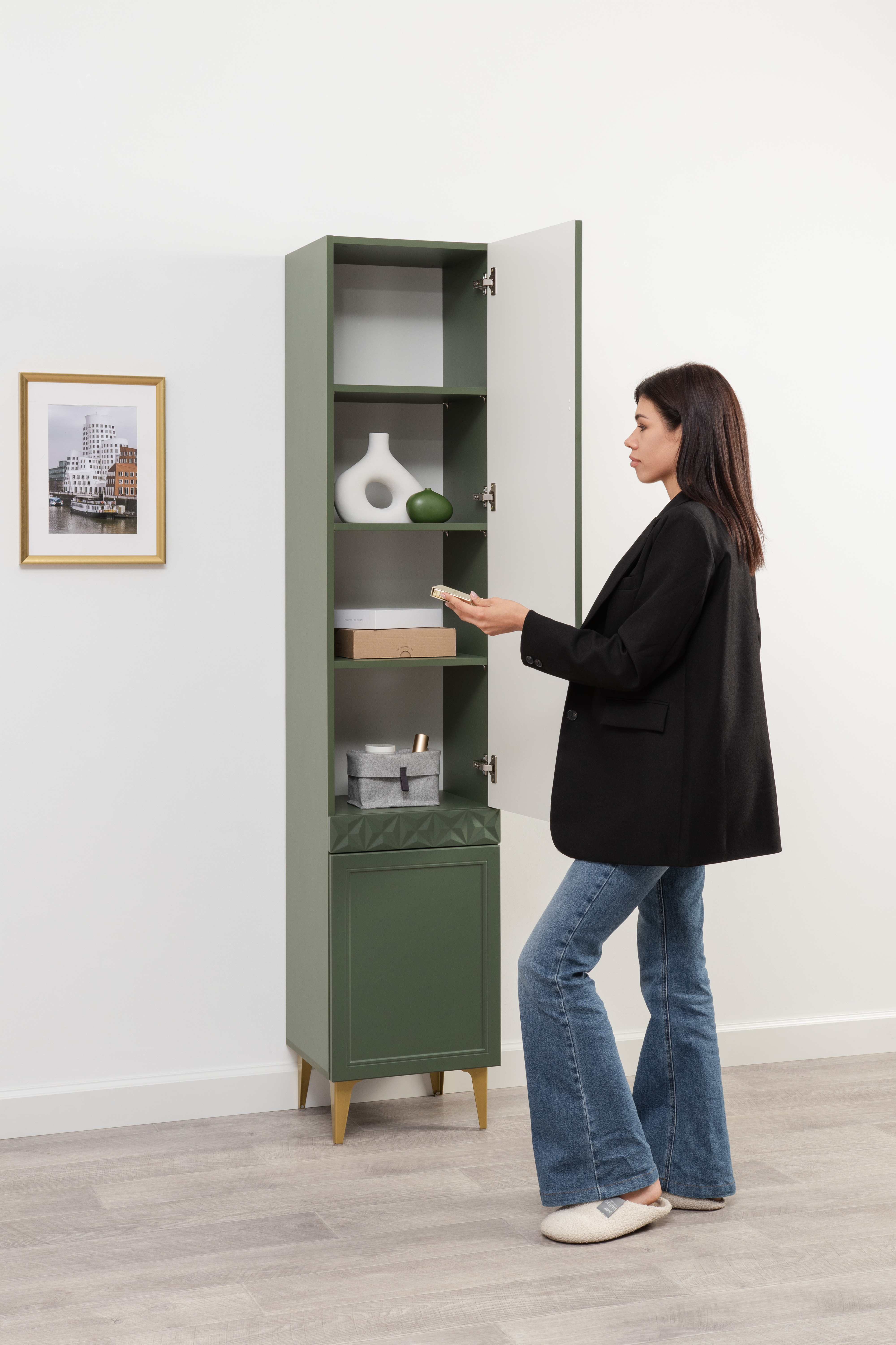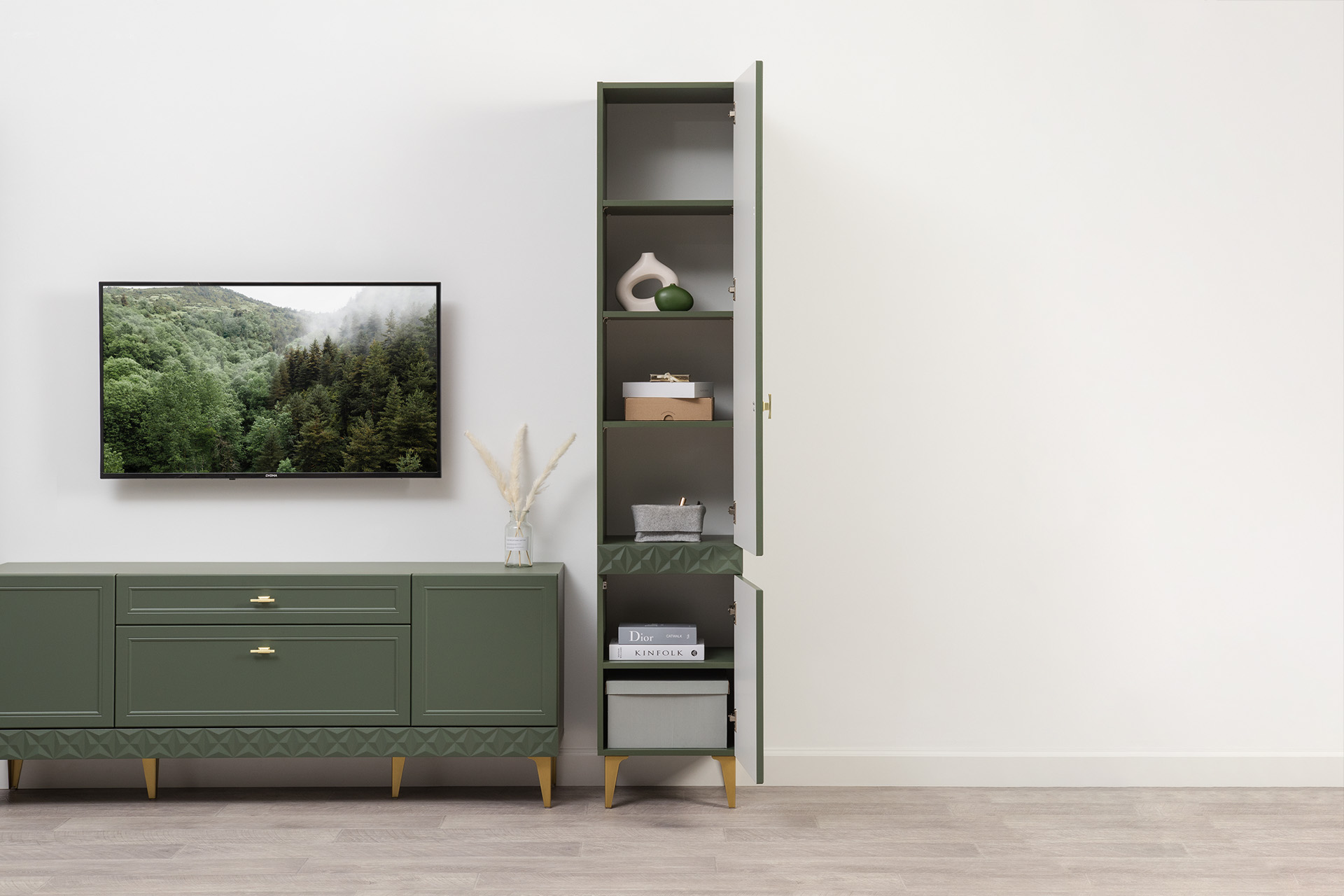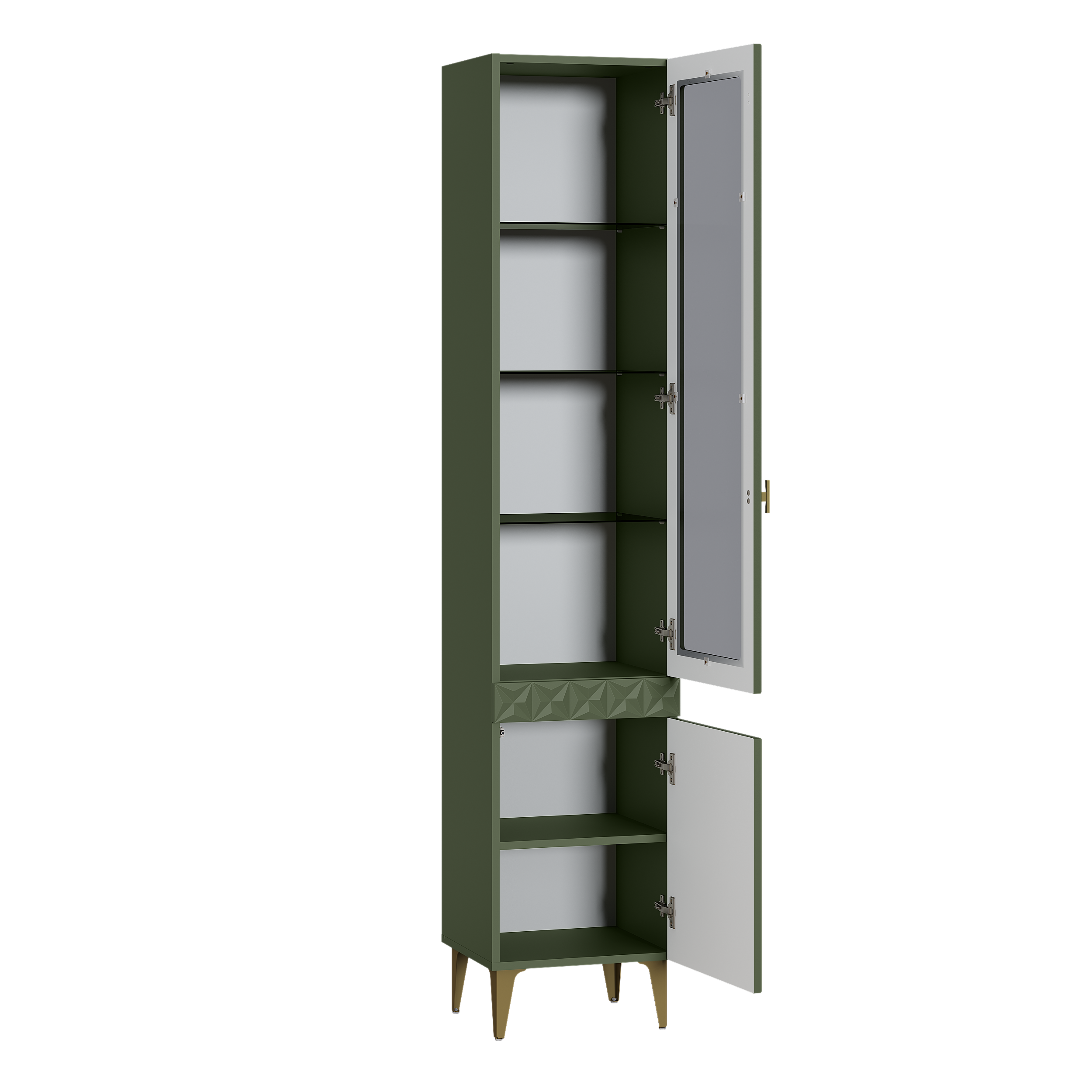 Шкаф-пенал Марион 16.333.01 дымчатый зеленый K521, олива шагрень AG 1050 ПВХ (собирается на любую сторону)