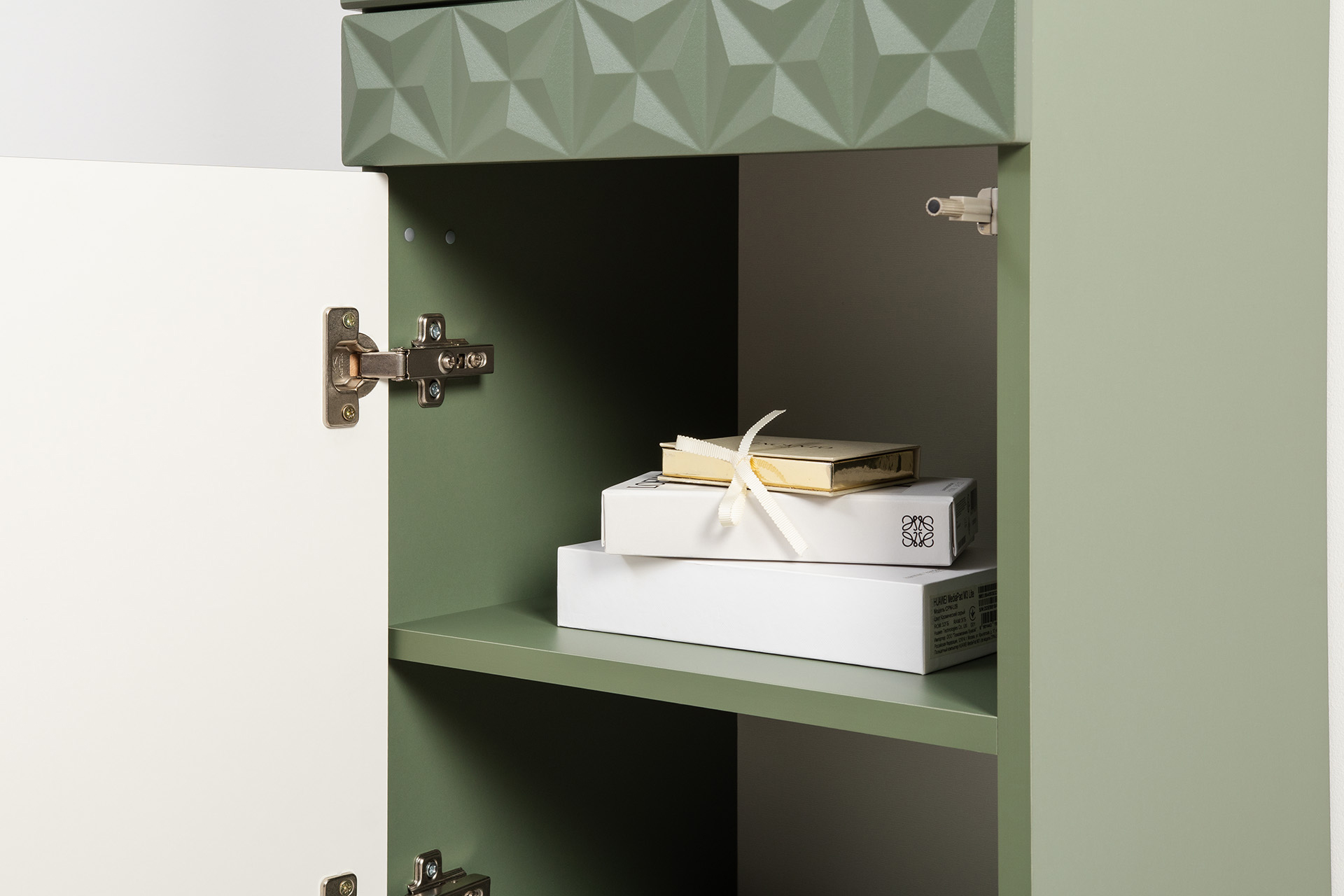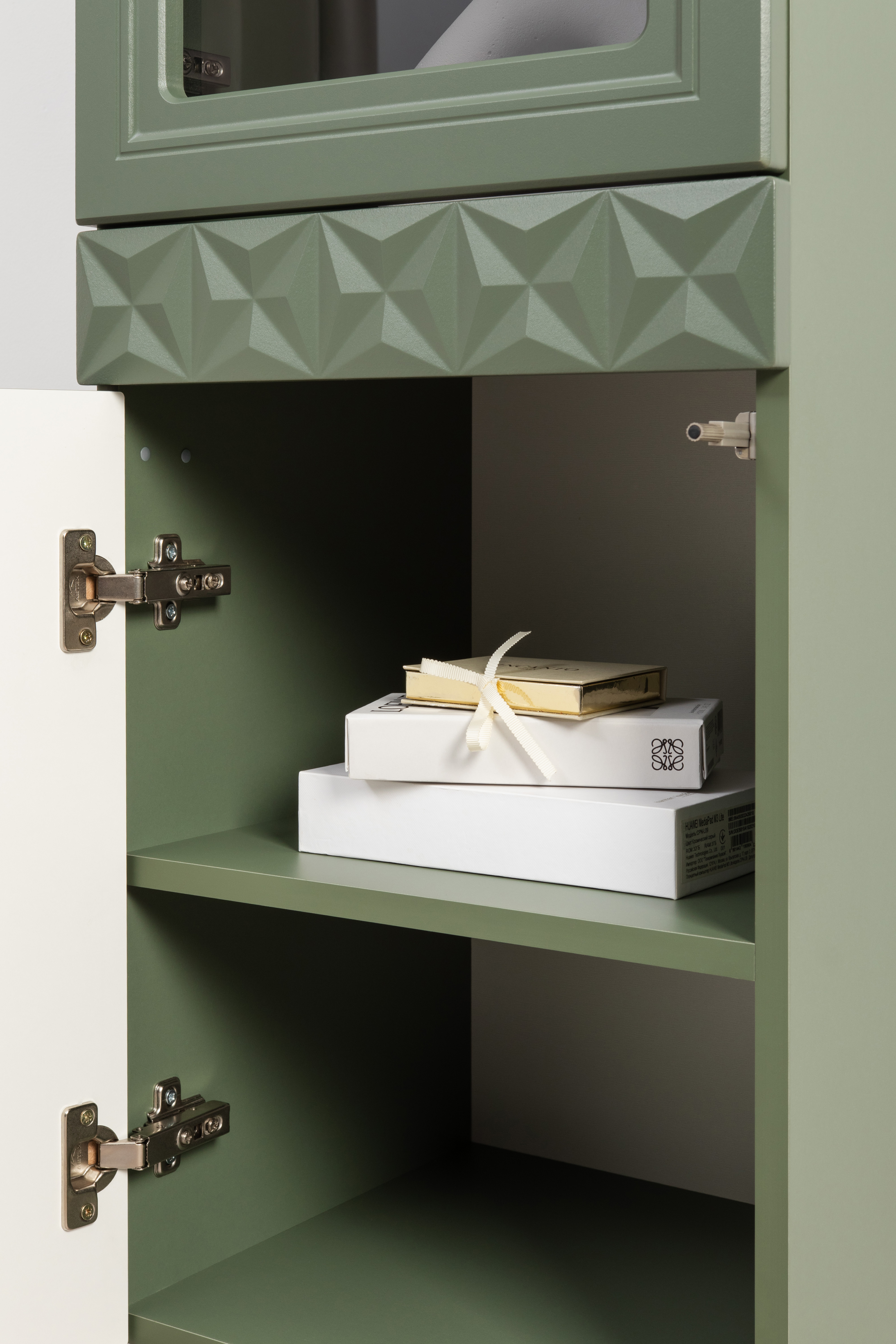 Шкаф навесной Марион 16.334 дымчатый зеленый K521, олива шагрень AG 1050 ПВХ (собирается на любую сторону)