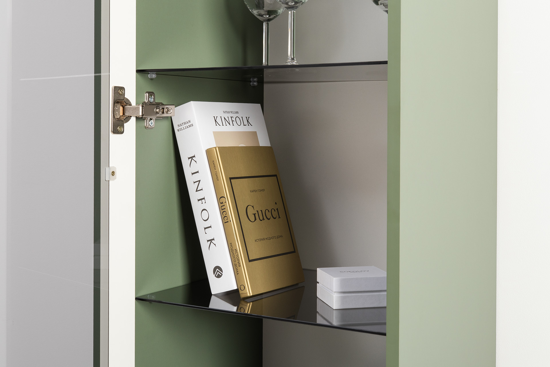 Шкаф-витрина Марион 16.397.01 дымчатый зеленый K521, олива шагрень AG 1050 ПВХ (собирается на любую сторону)