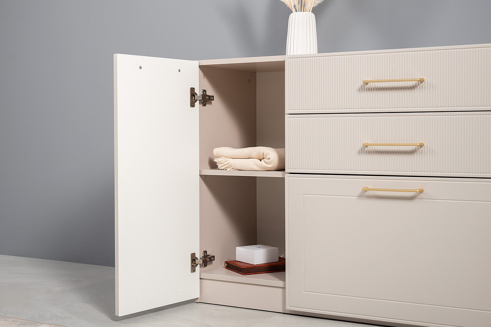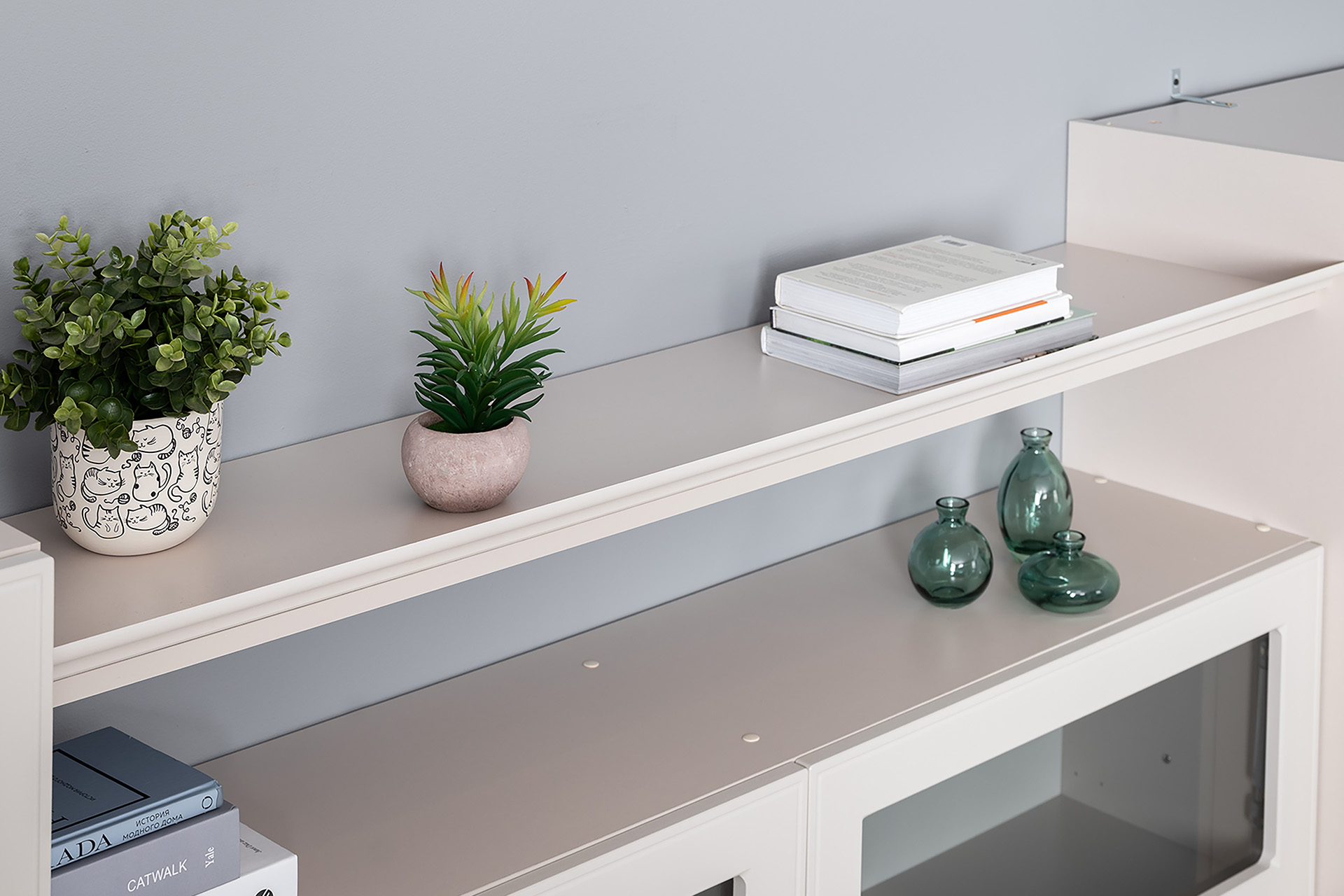 Гостиная Ричфорд композиция 2 без карнизов, кашемир 5981 BS, моно керамика D166-2 ПВХ, белый PE шагрень (собирается на любую сторону)