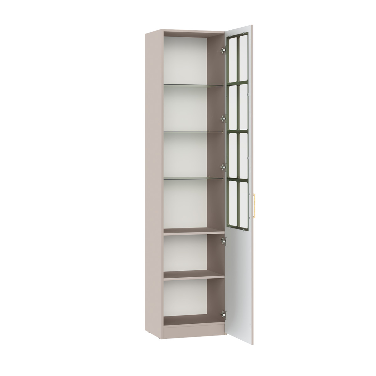 Фрезерованные фасады из МДФ, металлические ручки и витрины с тонированным стеклом создают изысканный образ.