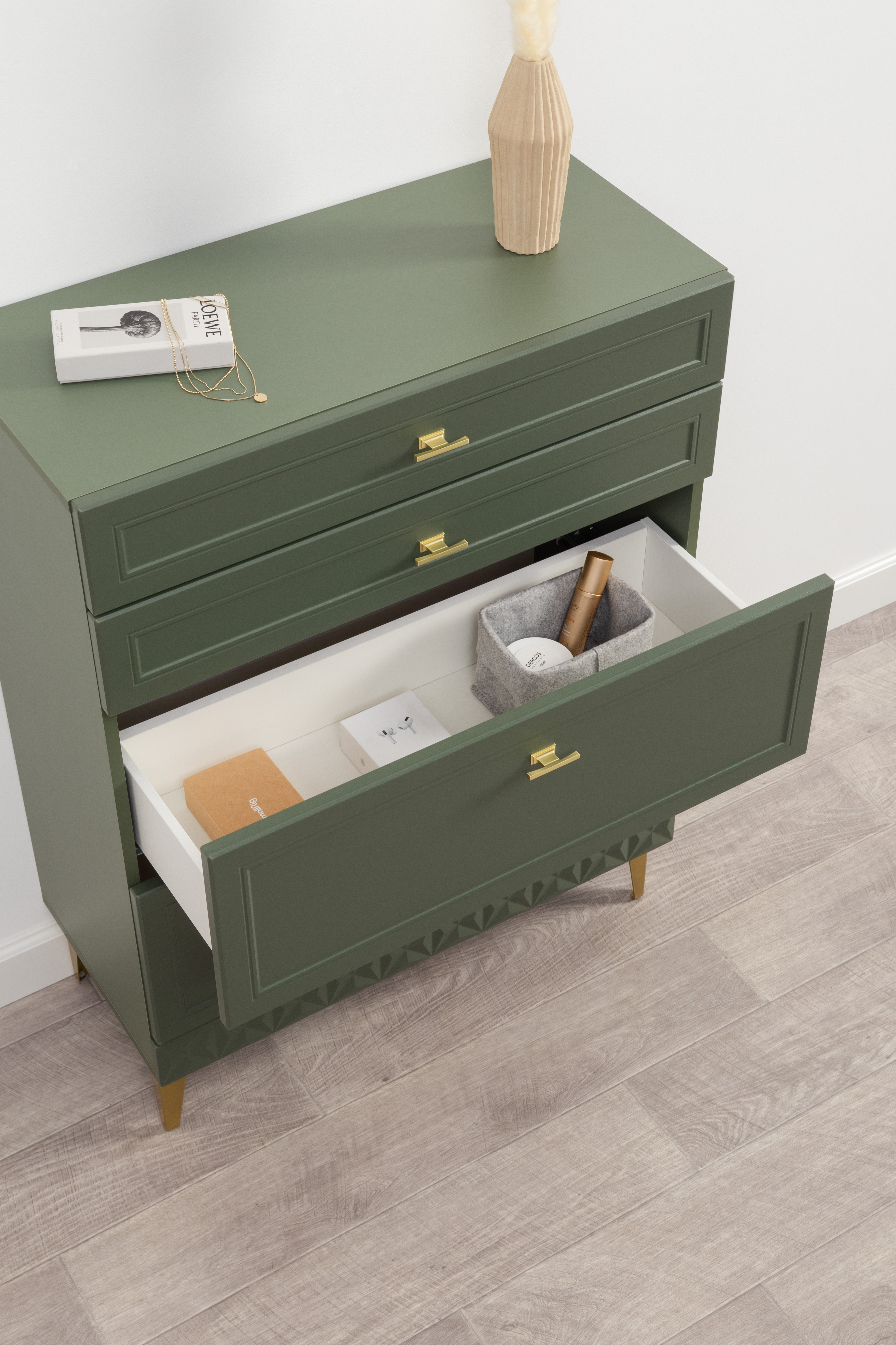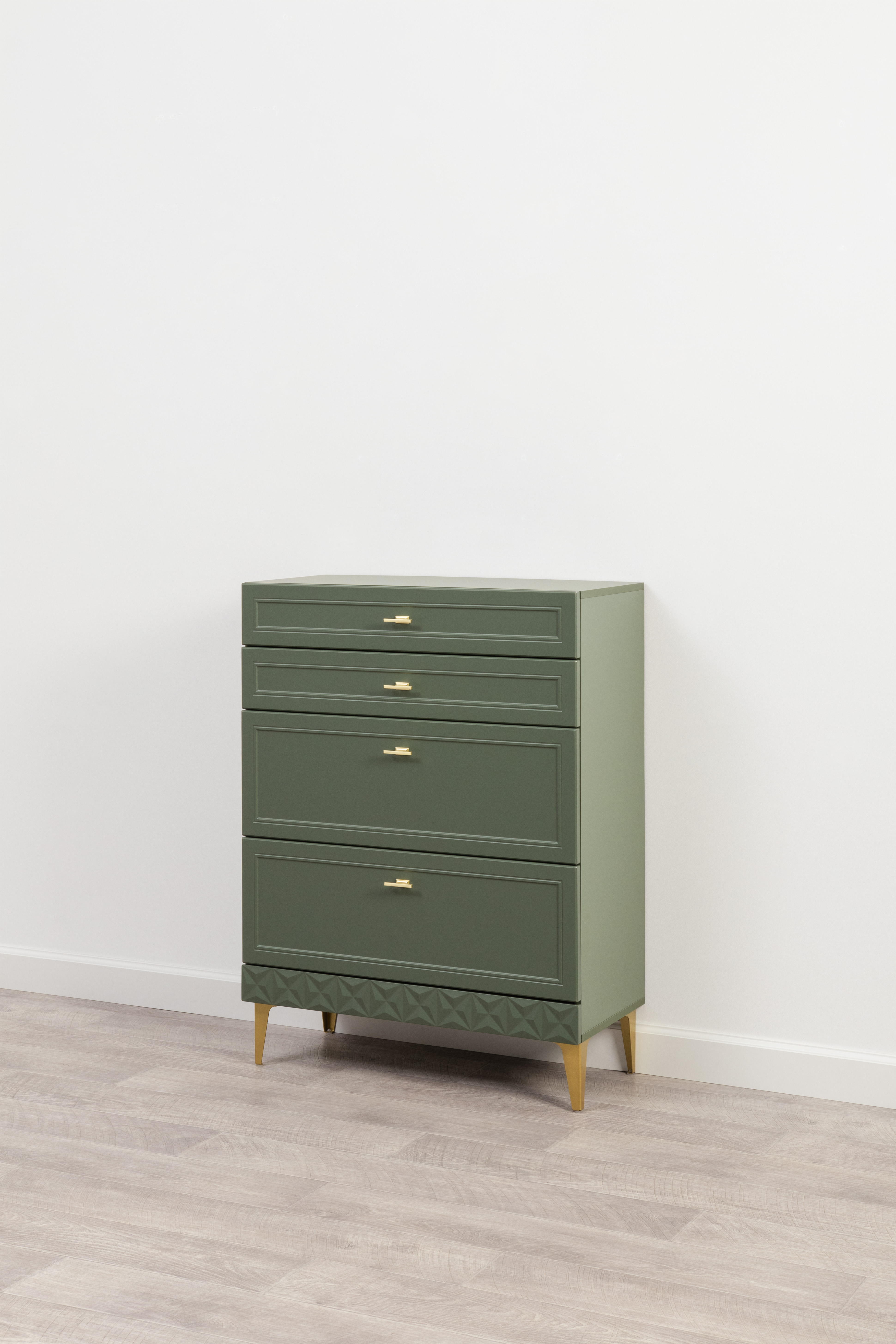 Комод Марион 16.249 дымчатый зеленый K521, олива шагрень AG 1050 ПВХ, белый PE шагрень