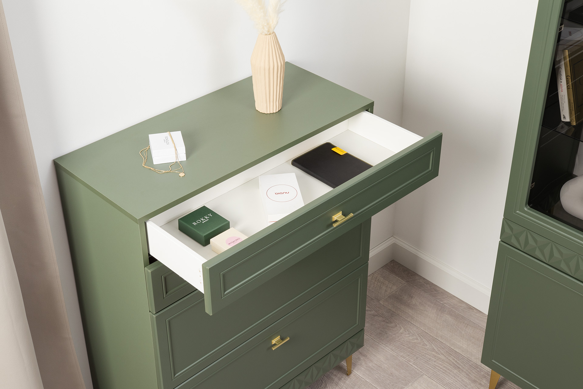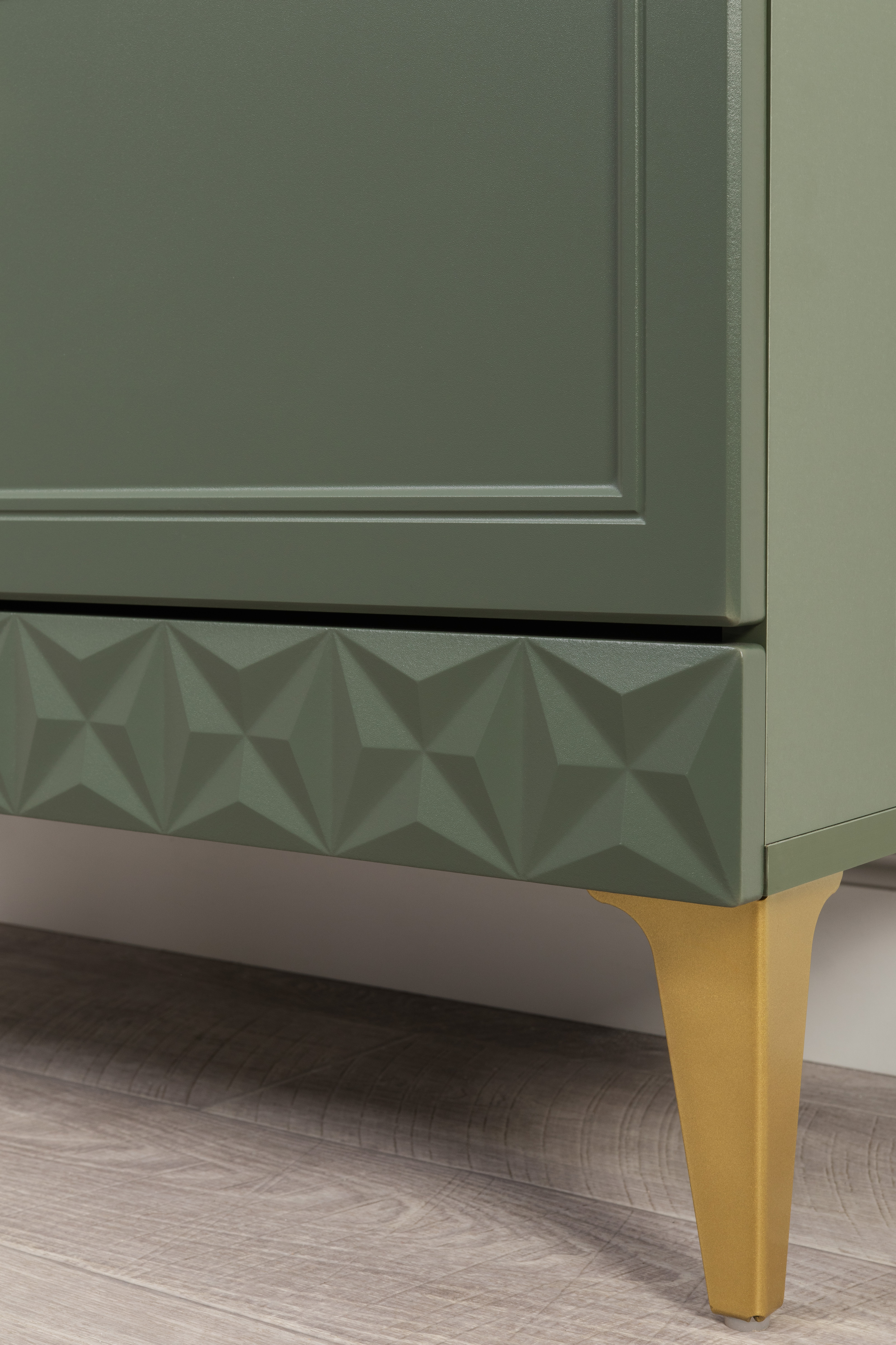Изящные линии, глубокая фрезеровка фасадов из МДФ и благородные оттенки. Утончённая «Слоновая кость» и изысканная «Олива Шагрень» с глубоким зелёным тоном — создают атмосферу уюта, тепла и благородства. Металлические ручки и опоры золотого цвета придают мебели утончённый блеск, а петли и направляющие с доводчиками обеспечивают плавное и бесшумное закрытие фасадов.