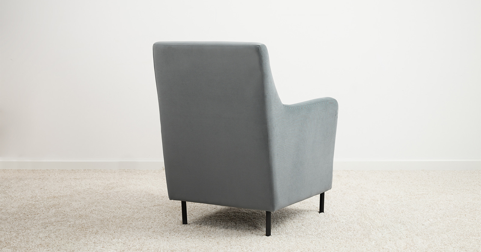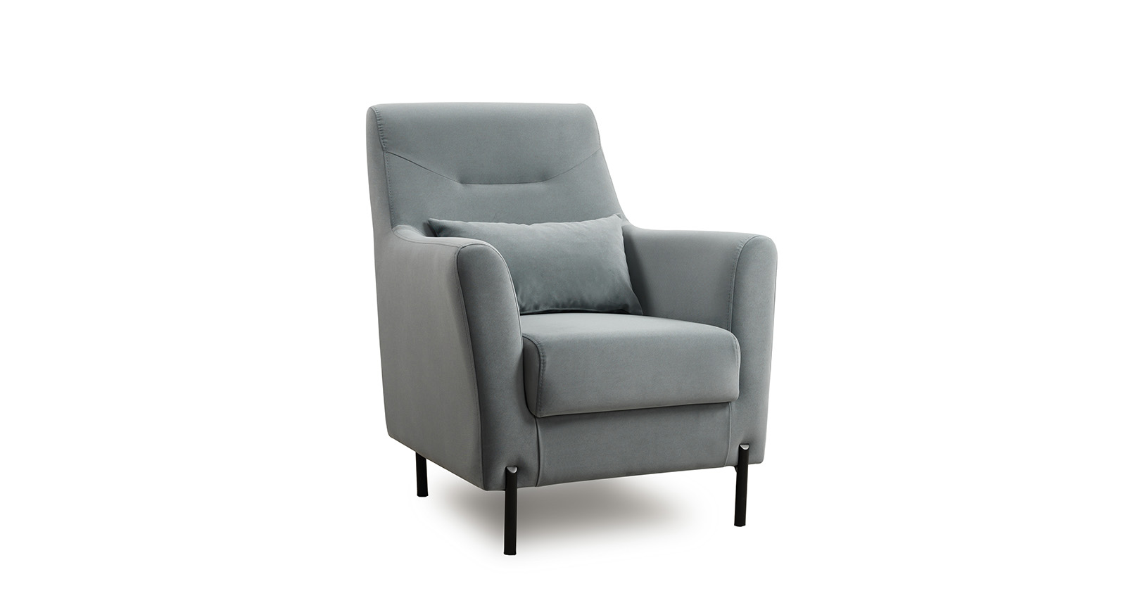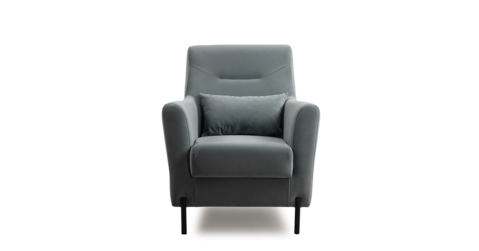 Декоративная утяжка на спинке кресла, декоративная подушка в цвете кресла, металлические опоры переходят в декоративный элемент подлокотника