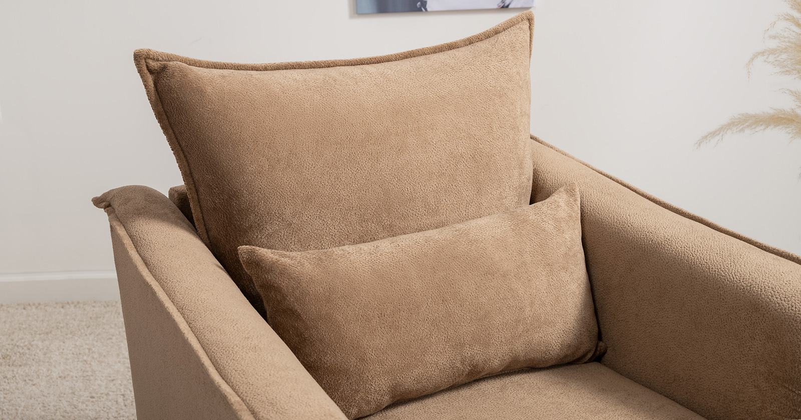 Кресло с приспинной подушкой трапецивидной формы на молнии, по трем сторонам которой проложена отделочная строчка на 1,2 см. По контуру боковин проложен декоративный кант на 1,2 см основной ткани. Кант проходит по центру передней части боковины, а по внутренней верхней части сборка.