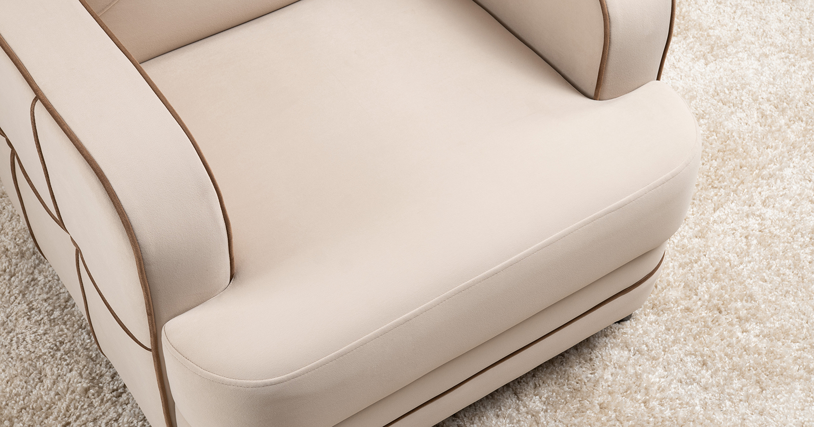Декоративные канты на вставке подлокотников. Пуговицы в местах пересечения кантов на подушке и вставке подлокотников. По торцам подлокотников и думках контрастный декоративный кант. Защипы на сиденье и подушке.