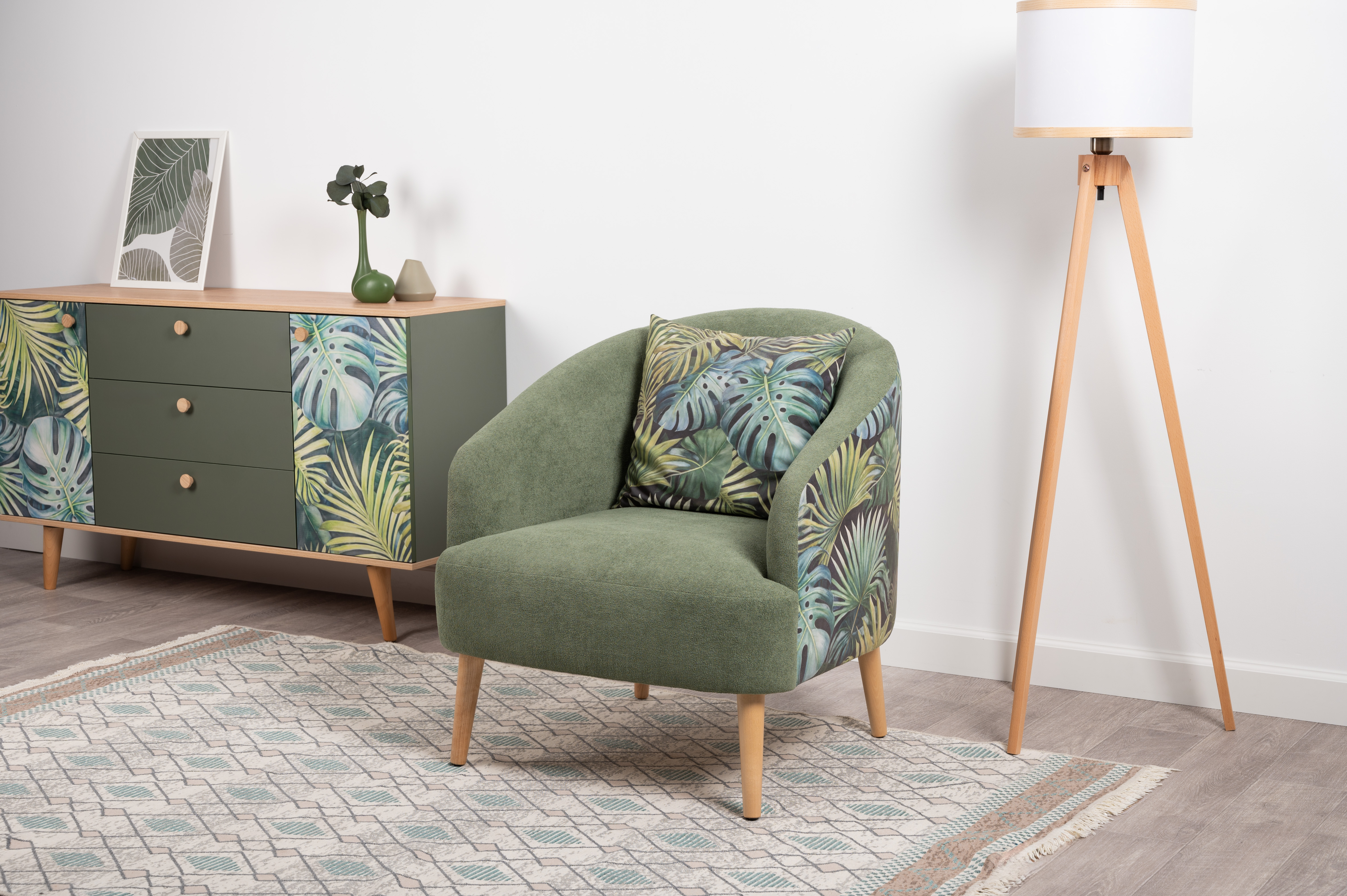 Маттиас — оригинальное кресло готовое стать акцентом в интерьере. Яркий тропический принт «монстера» на спинке мгновенно сделает комнату живой и современной.