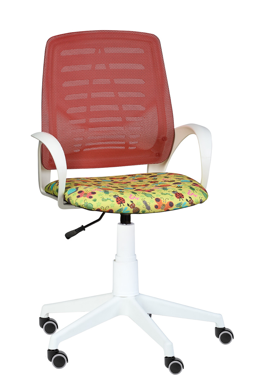 Кресло на колесах Ирис белый каркас, обивка сидушка - ткань саржа букашки, спинка красный, подлокотники пластик, крестовина пластик, без качания