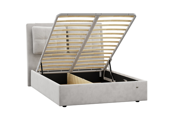 Подъемный механизм легок в управлении, а вместительный короб внутри кровати подойдет для хранения подушек, белья и других вещей.