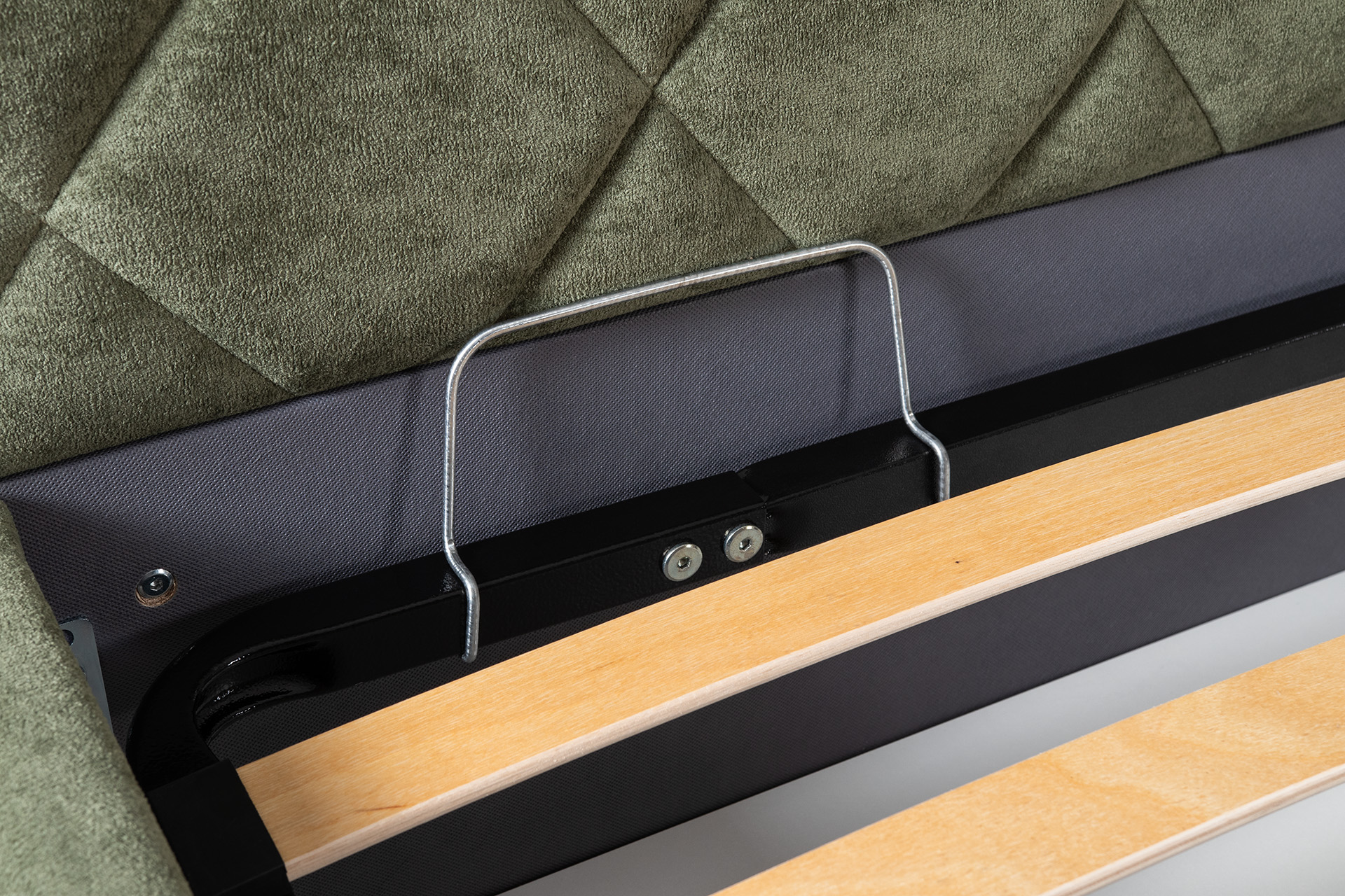 Основание кровати укомплектовано матрасодержателями. Жесткое кроватное дно из ЛДСП 16 мм на опорах 25 мм.