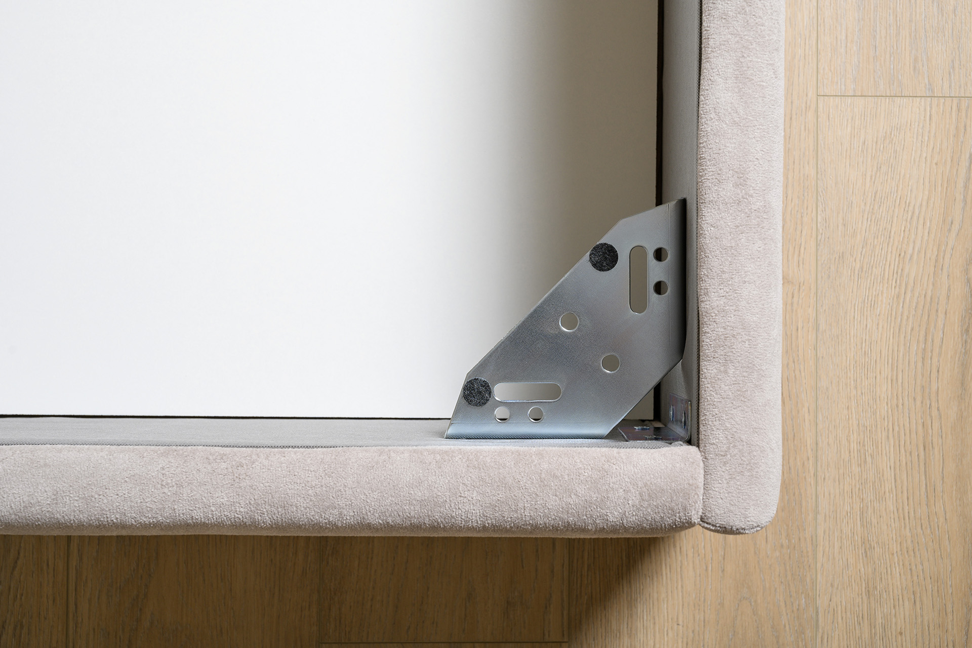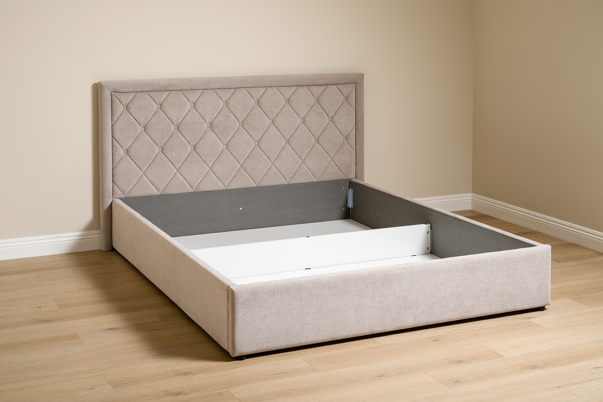 Основание кровати укомплектовано матрасодержателями. Жесткое кроватное дно из ЛДСП 16 мм на опорах 25 мм.
