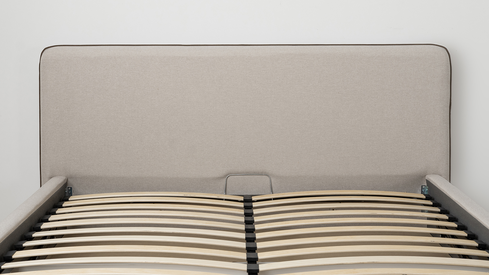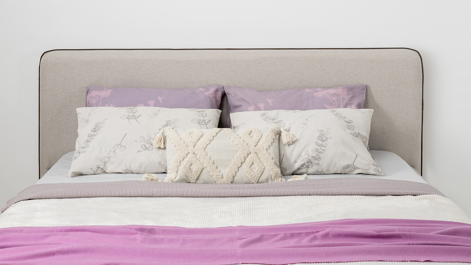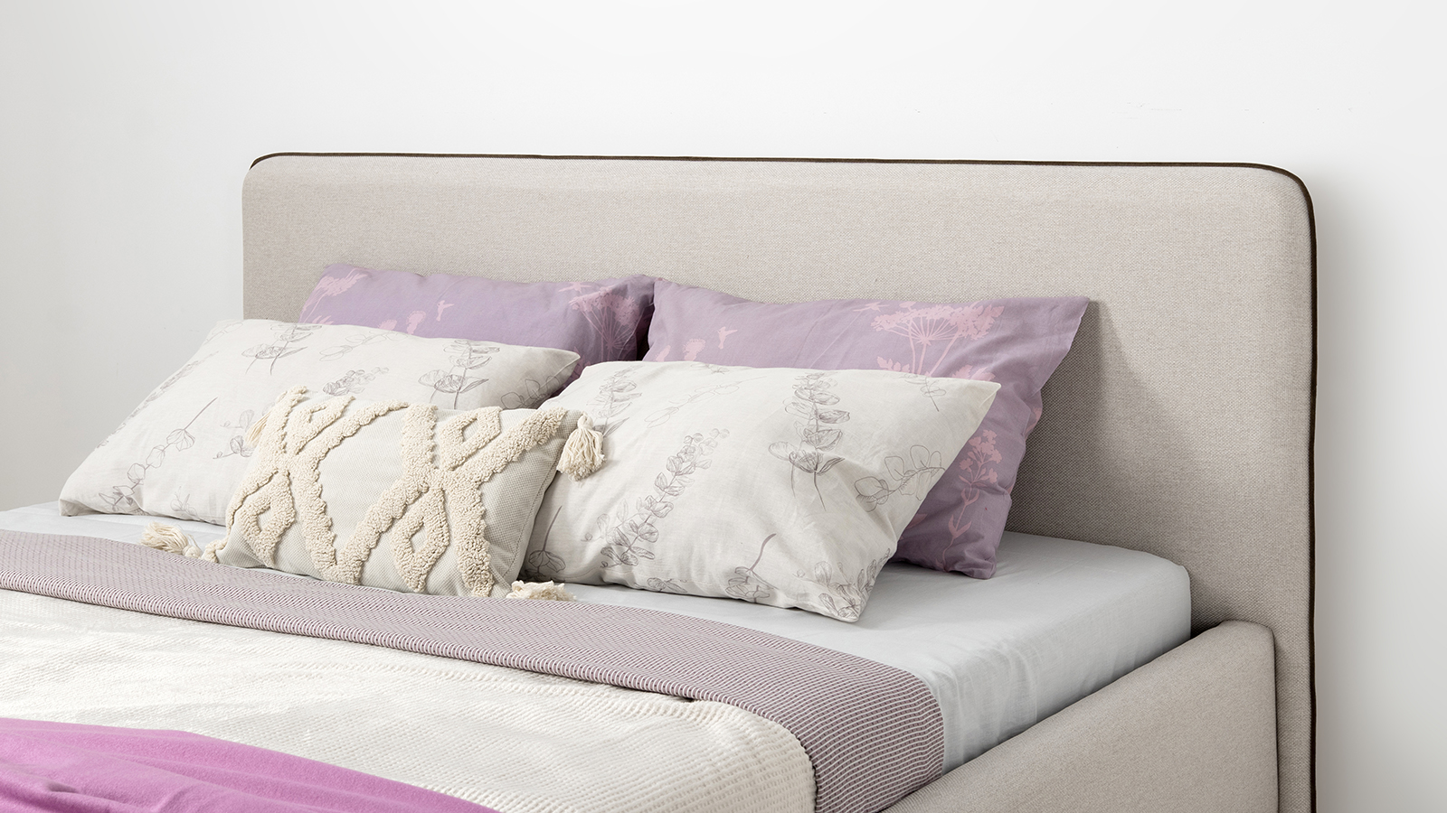 Cкругленный торец изголовья оформлен контрастным кантом.