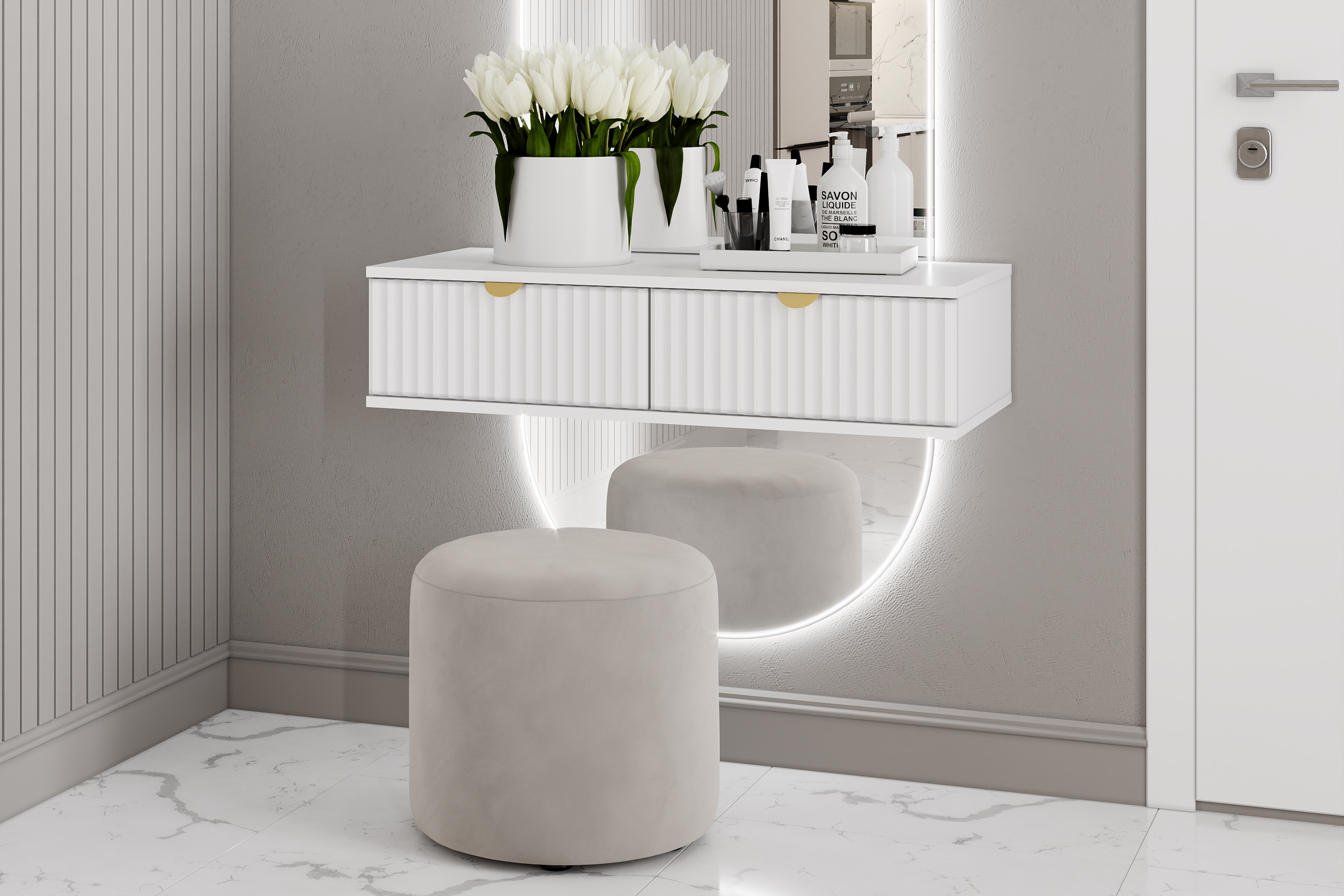 Модульная композиция включает тумбу, оснащенную выдвижными ящиками, которые открываются плавно и бесшумно благодаря шариковым направляющим, а в шкафу удобно организовать предметы одежды, при этом высокие опоры облегчают процесс уборки.
