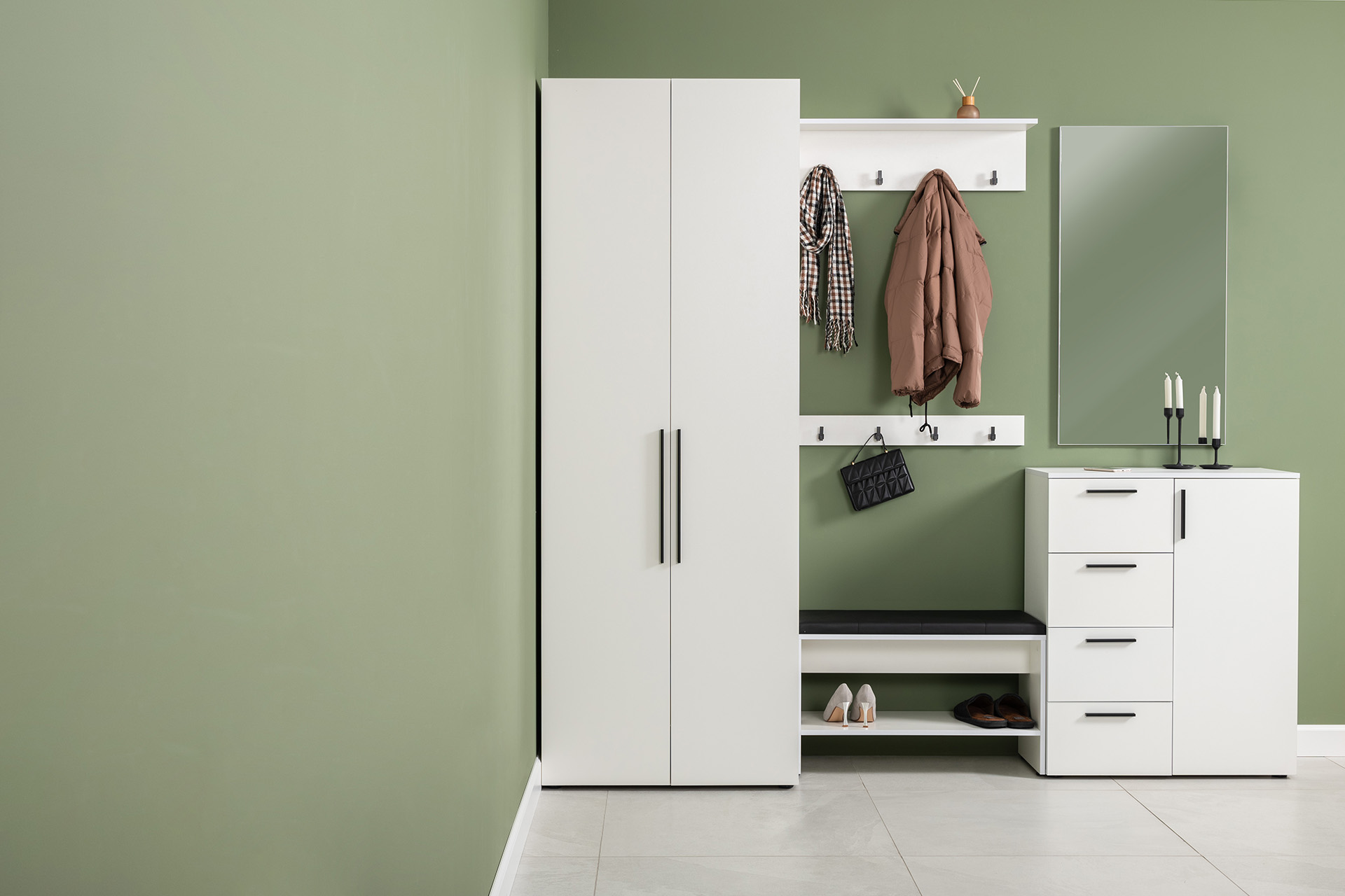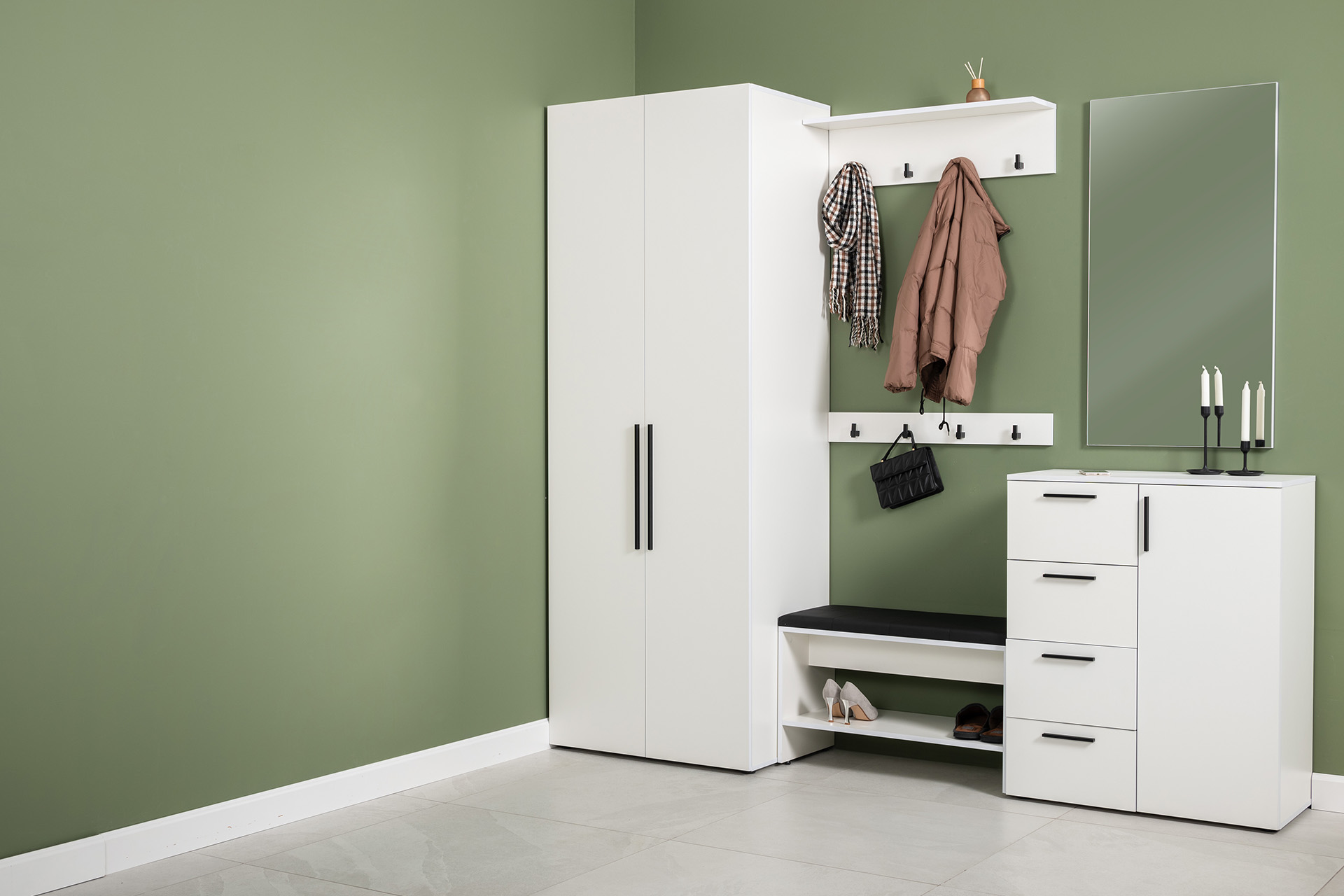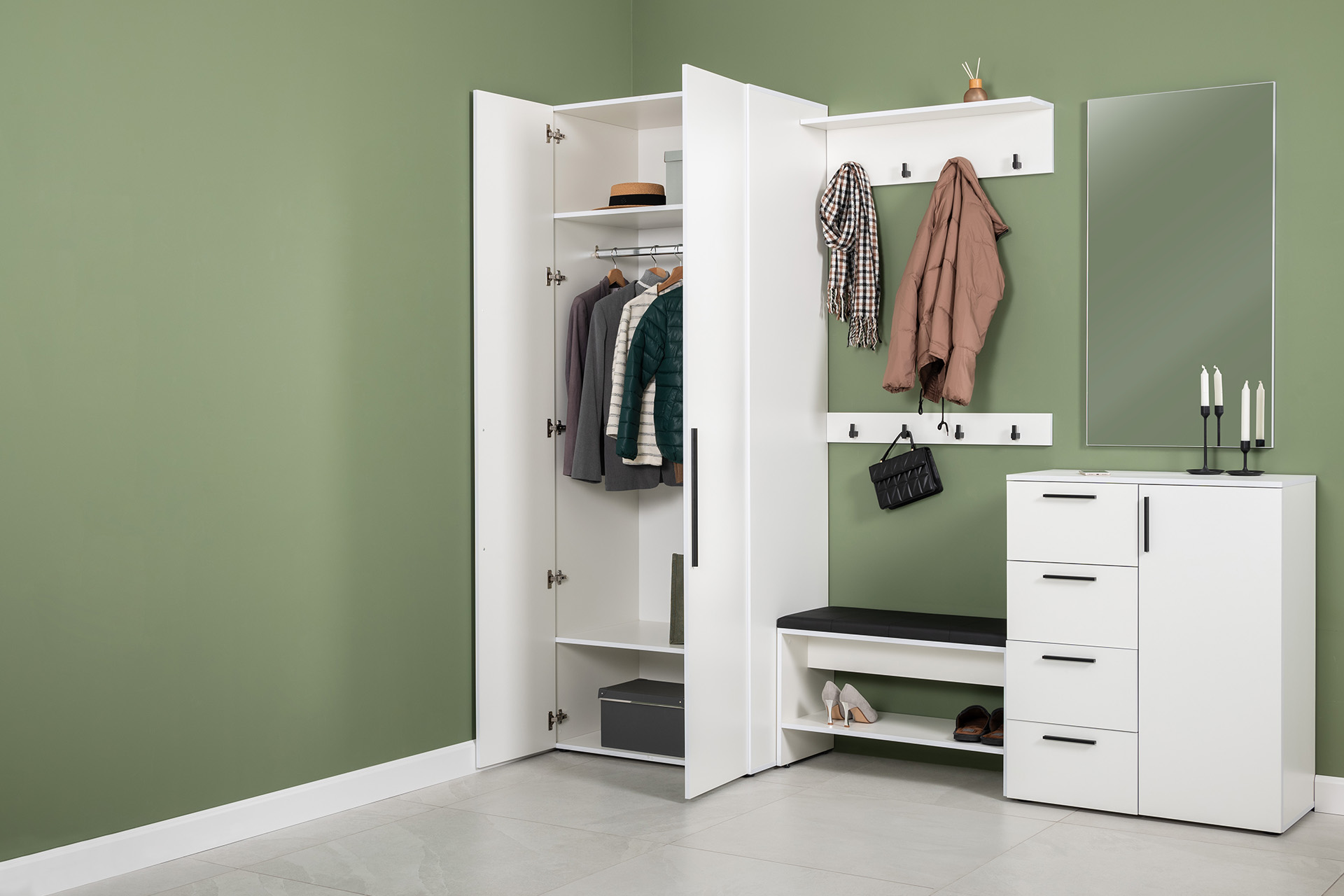 Вместительный шкаф полноразмерной глубины можно дополнить тумбой для обуви с мягким сиденьем и нишами для хранения, зеркалом и минималистичными вешалками.