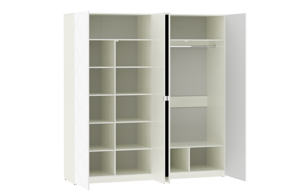 Четырехстворчатый шкаф Summit НМ 011.48 станет достойной альтернативой гардеробной комнате, сэкономит пространство и задаст стиль интерьеру спальни. Внутри модуль разделен на две равные секции. В левой части шкафа находится секция из восьми полок для хранения одежды в сложенном виде. В правой половине модуля установлена штанга для одежды на вешалках плечиках. Зеркальные фасады добавят свет и визуально расширят комнату.