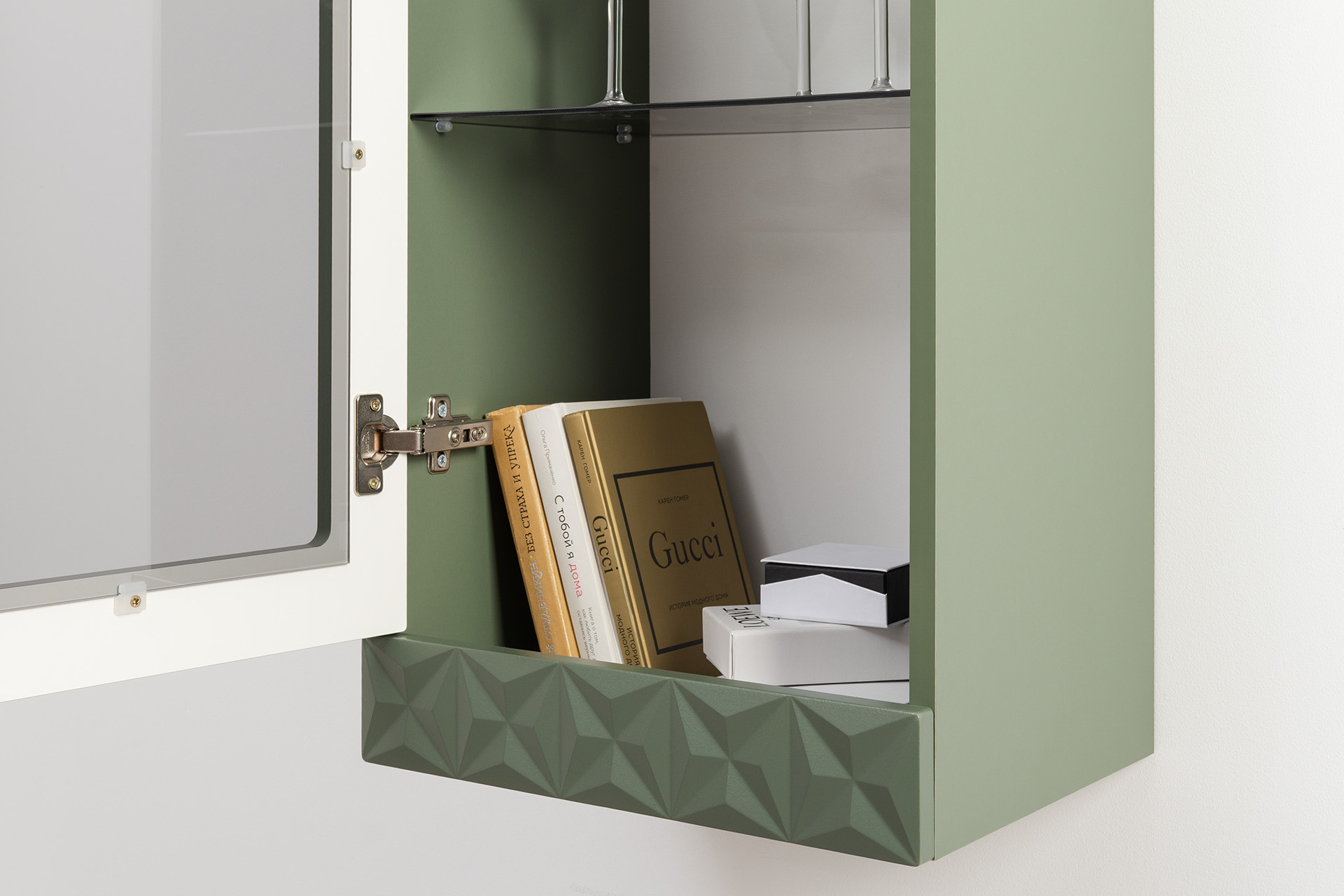 Шкаф навесной Марион 16.334 дымчатый зеленый K521, олива шагрень AG 1050 ПВХ (собирается на любую сторону)