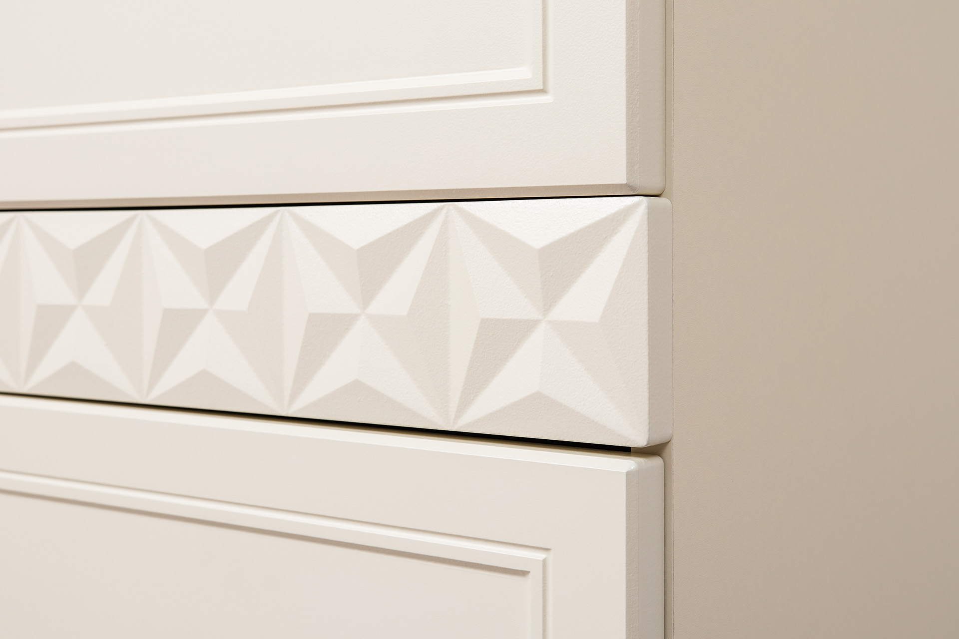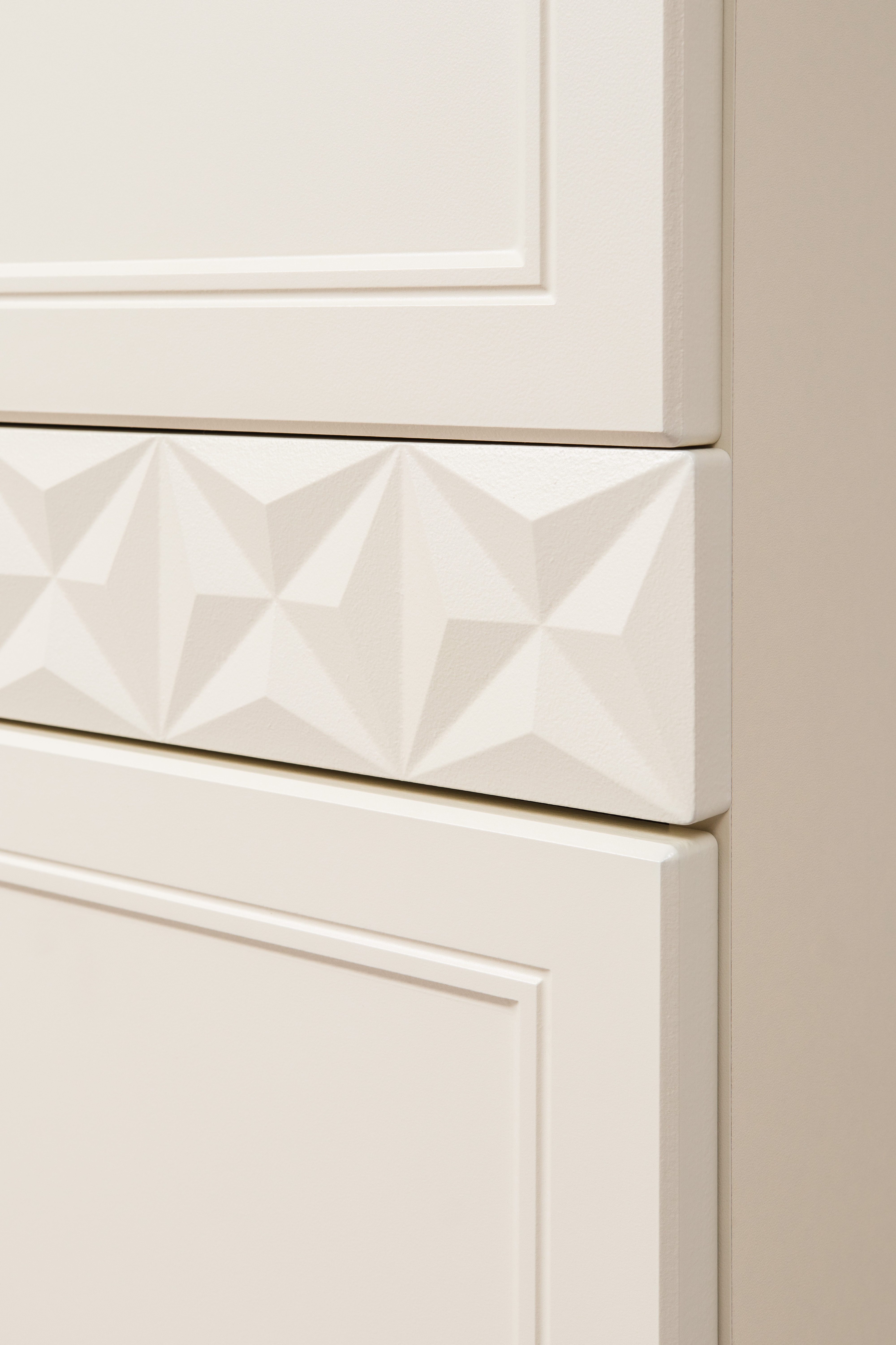 Изящные линии, глубокая фрезеровка фасадов из МДФ и благородные оттенки. Утончённая «Слоновая кость» и изысканная «Олива Шагрень» с глубоким зелёным тоном — создают атмосферу уюта, тепла и благородства. Металлические ручки и опоры золотого цвета придают мебели утончённый блеск, а петли и направляющие с доводчиками обеспечивают плавное и бесшумное закрытие фасадов.