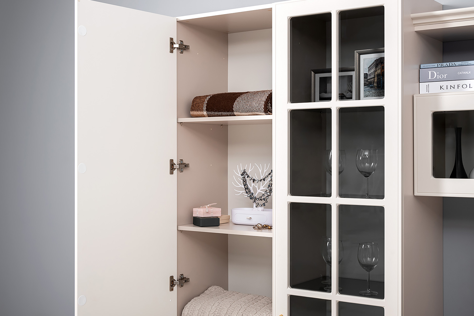 Шкаф-витрина в гостиную Ливерпуль белый, ясень ваниль ПВХ