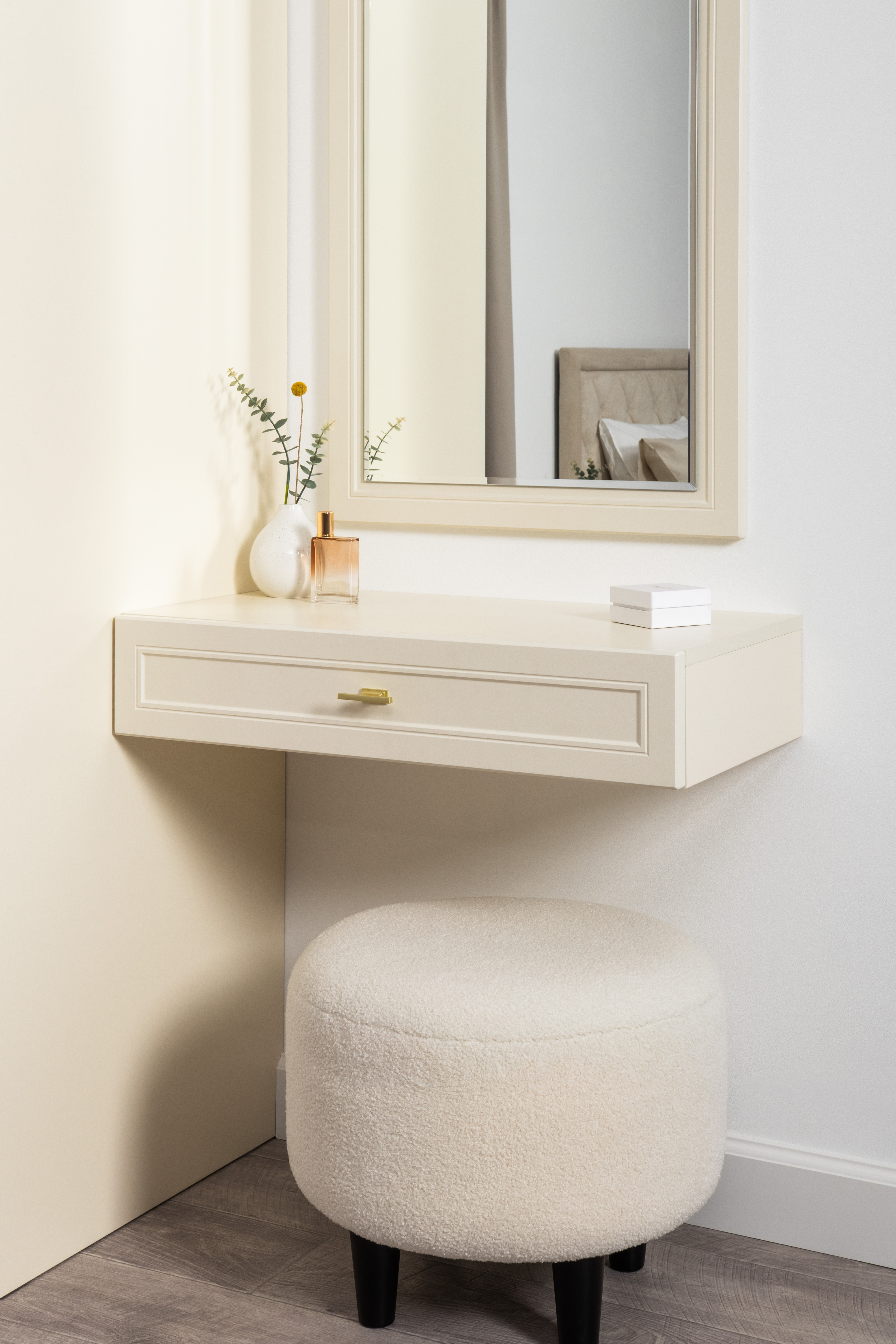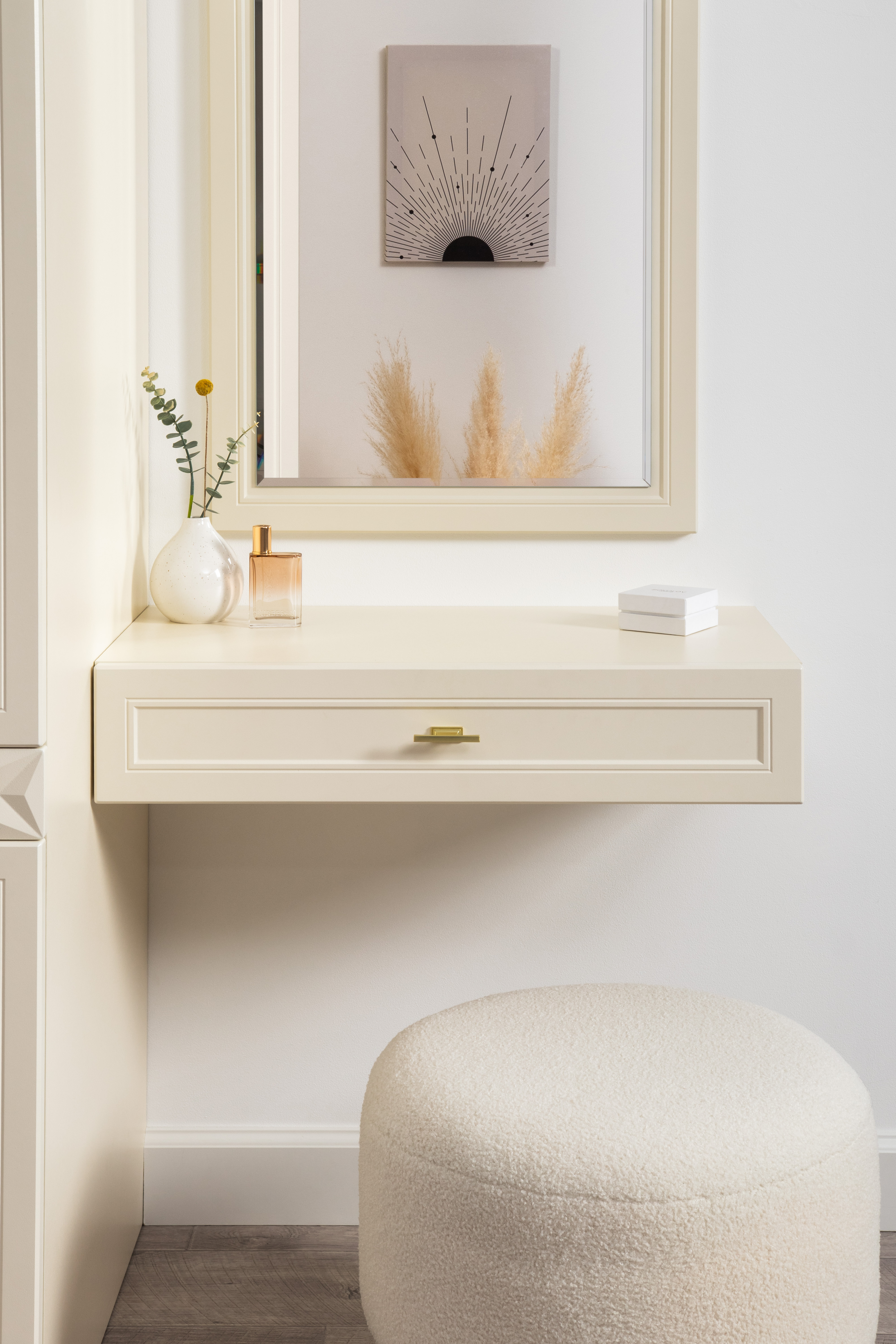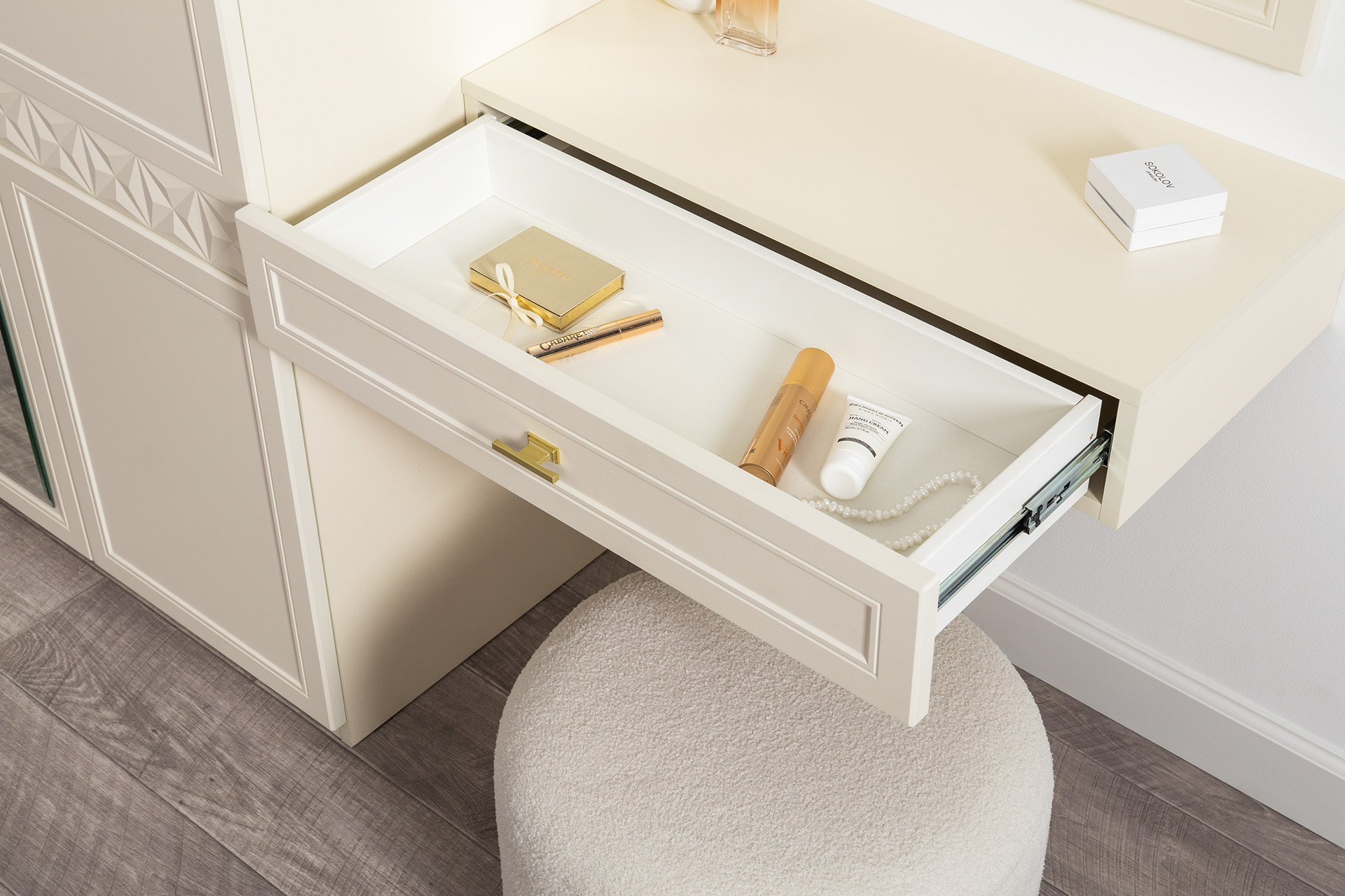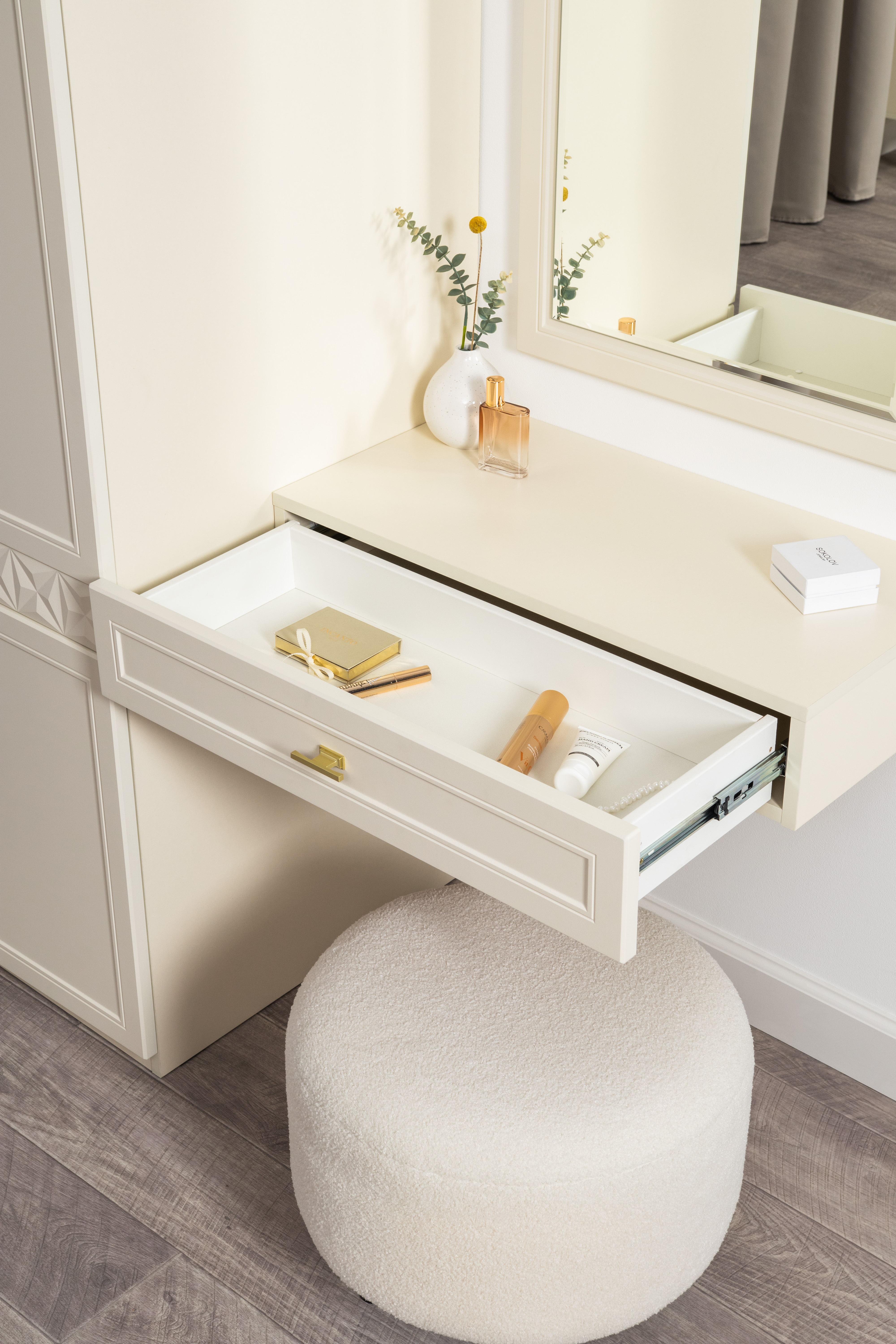 Изящные линии, глубокая фрезеровка фасадов из МДФ и благородные оттенки. Утончённая «Слоновая кость» и изысканная «Олива Шагрень» с глубоким зелёным тоном — создают атмосферу уюта, тепла и благородства. Металлические ручки и опоры золотого цвета придают мебели утончённый блеск, а петли и направляющие с доводчиками обеспечивают плавное и бесшумное закрытие фасадов.
