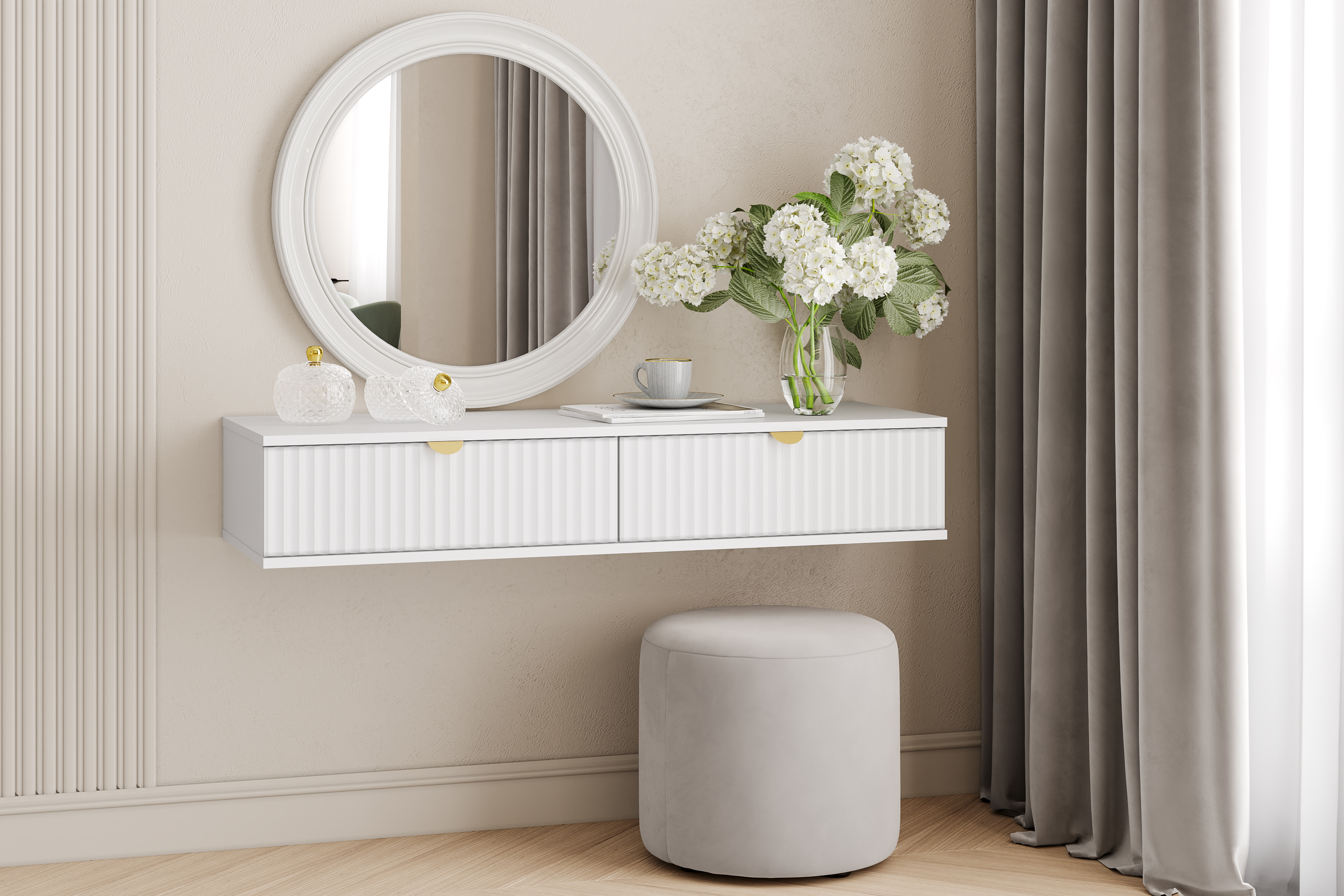 Тумба оснащена двумя выдвижными ящиками, которые открываются плавно и бесшумно благодаря шариковым направляющим.
