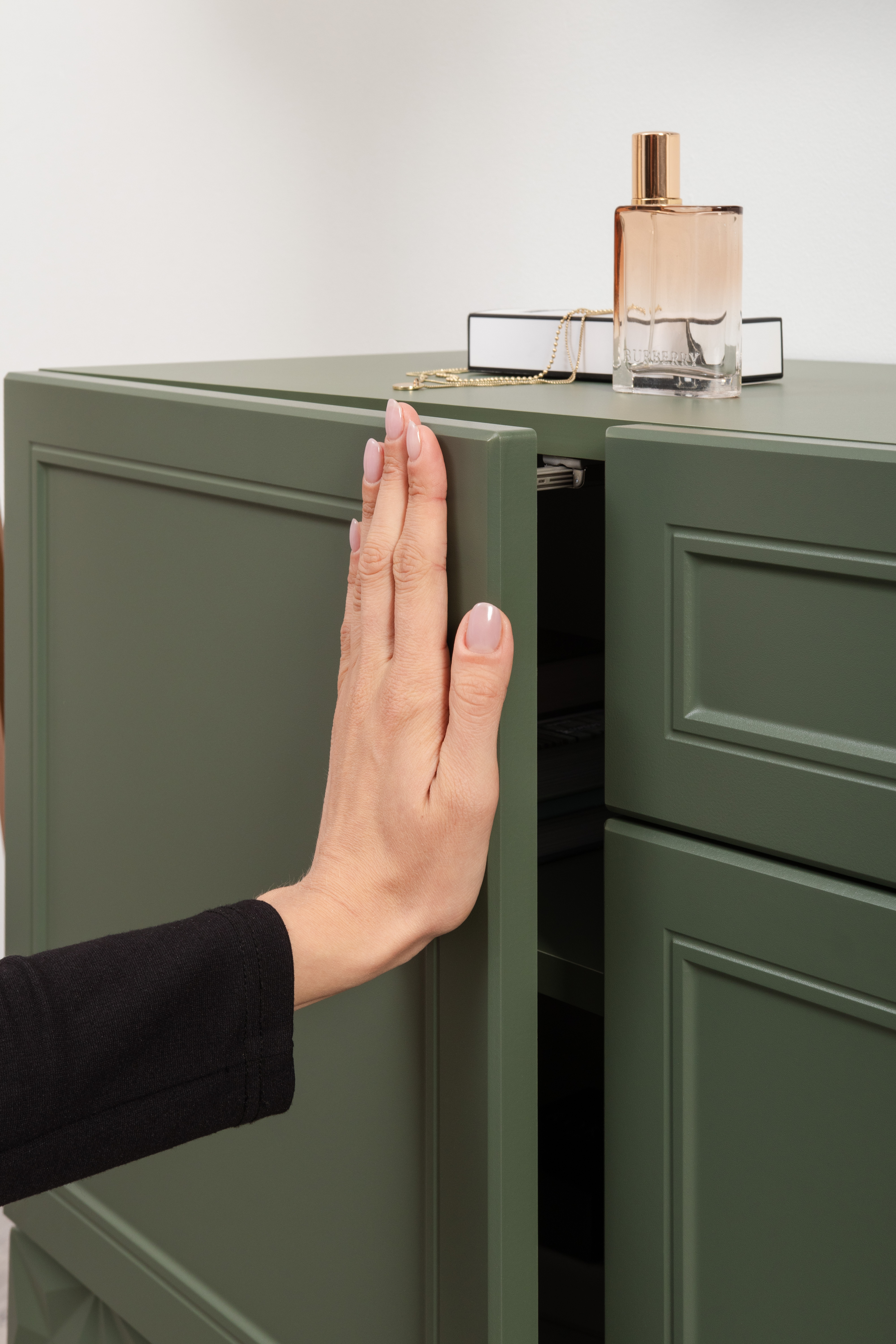 Комод Марион 16.249 дымчатый зеленый K521, олива шагрень AG 1050 ПВХ, белый PE шагрень