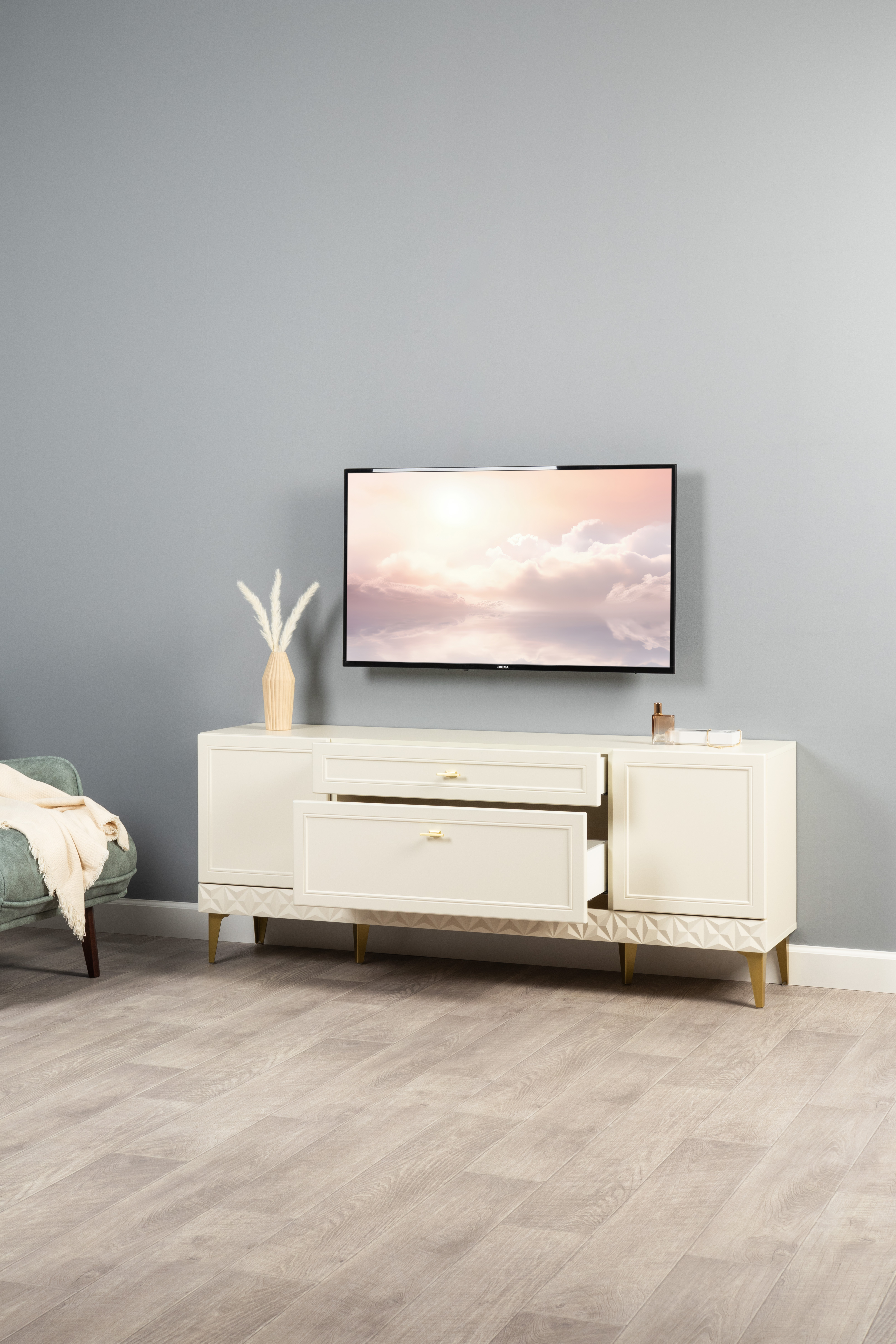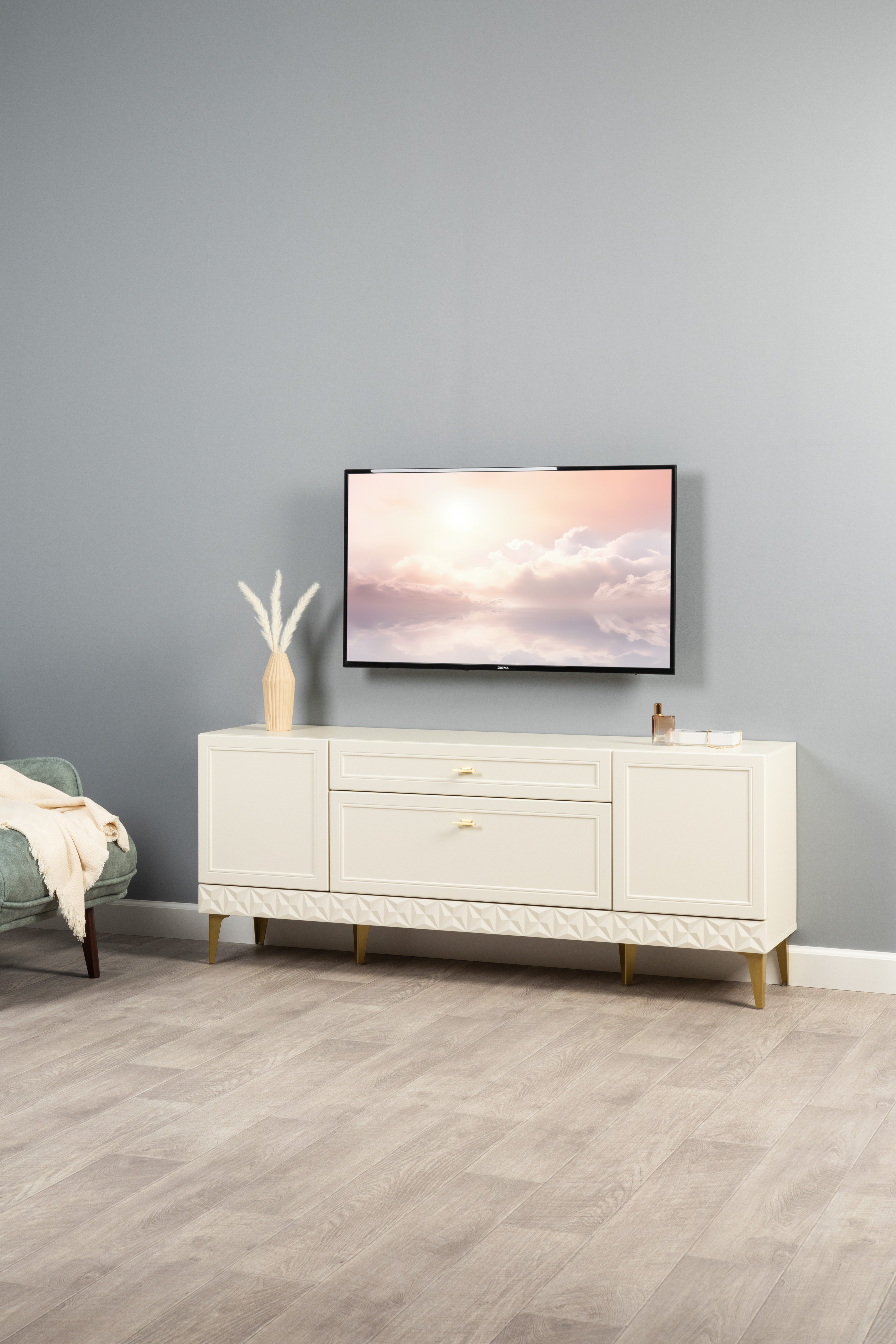 Комод Марион 16.249 дымчатый зеленый K521, олива шагрень AG 1050 ПВХ, белый PE шагрень