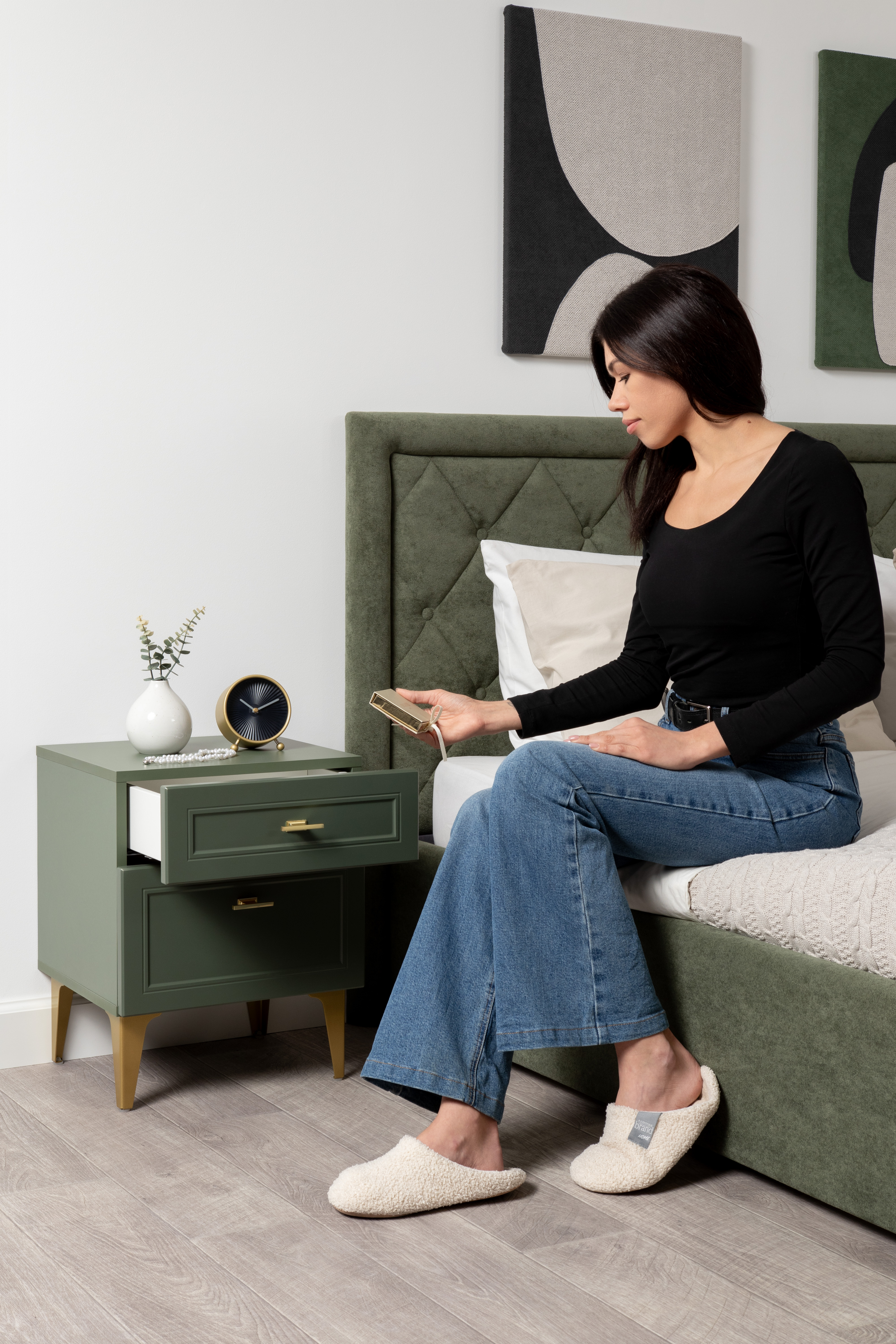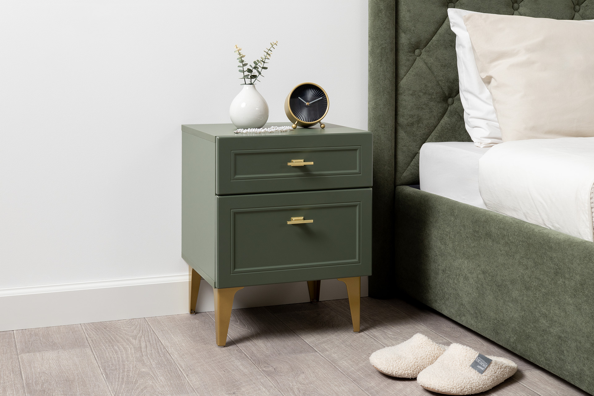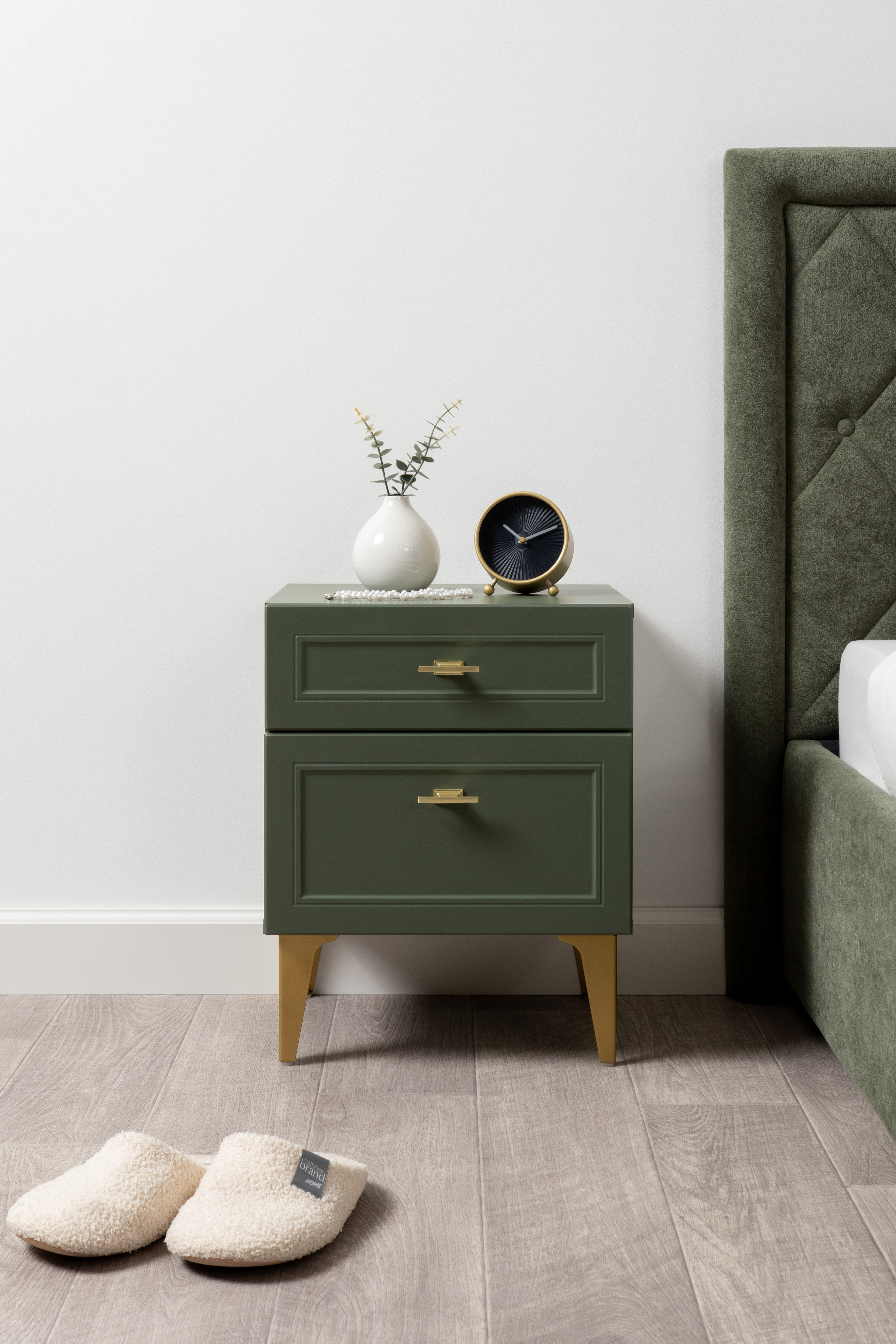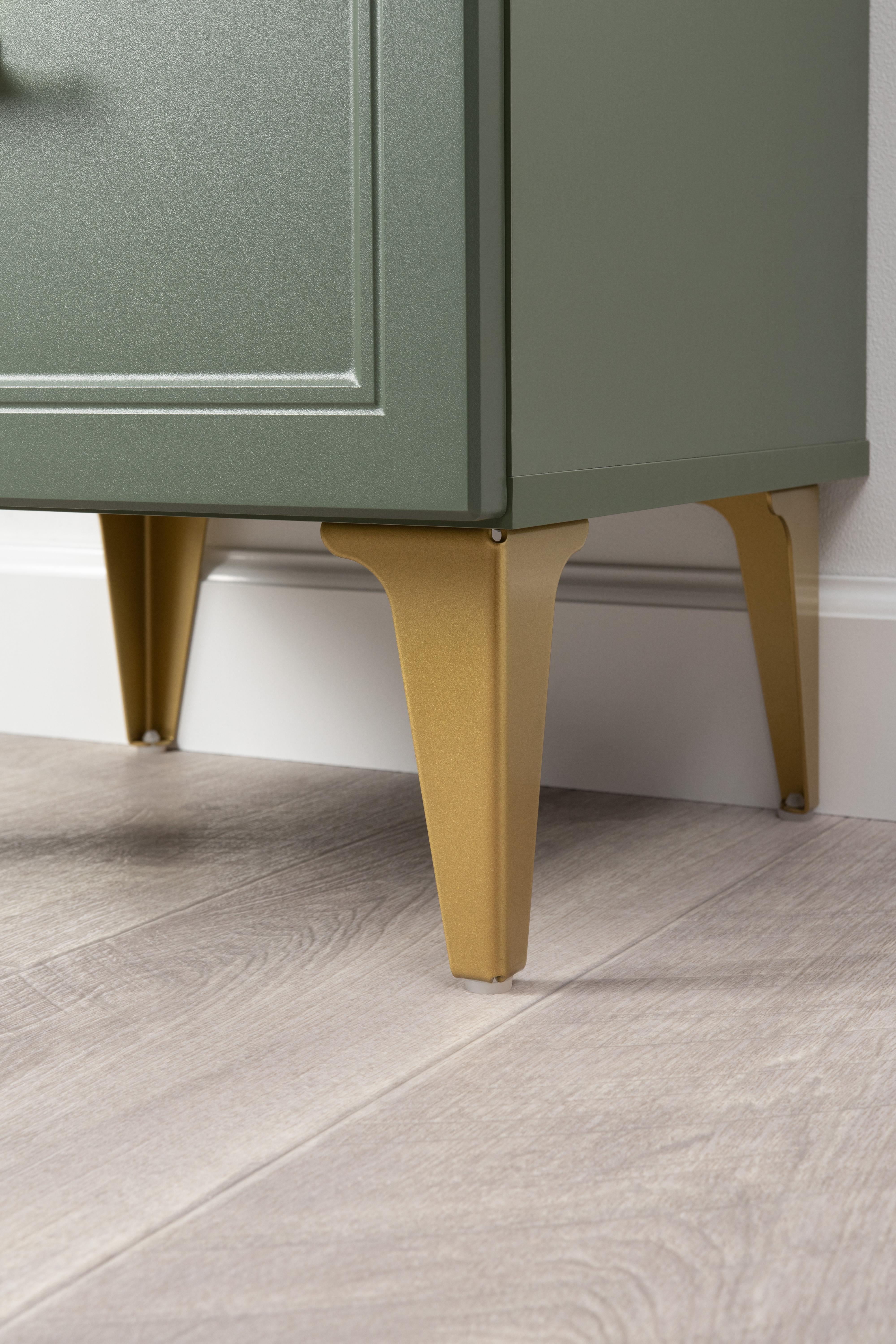 Изящные линии, глубокая фрезеровка фасадов из МДФ и благородные оттенки. Утончённая «Слоновая кость» и изысканная «Олива Шагрень» с глубоким зелёным тоном — создают атмосферу уюта, тепла и благородства. Металлические ручки и опоры золотого цвета придают мебели утончённый блеск, а петли и направляющие с доводчиками обеспечивают плавное и бесшумное закрытие фасадов.