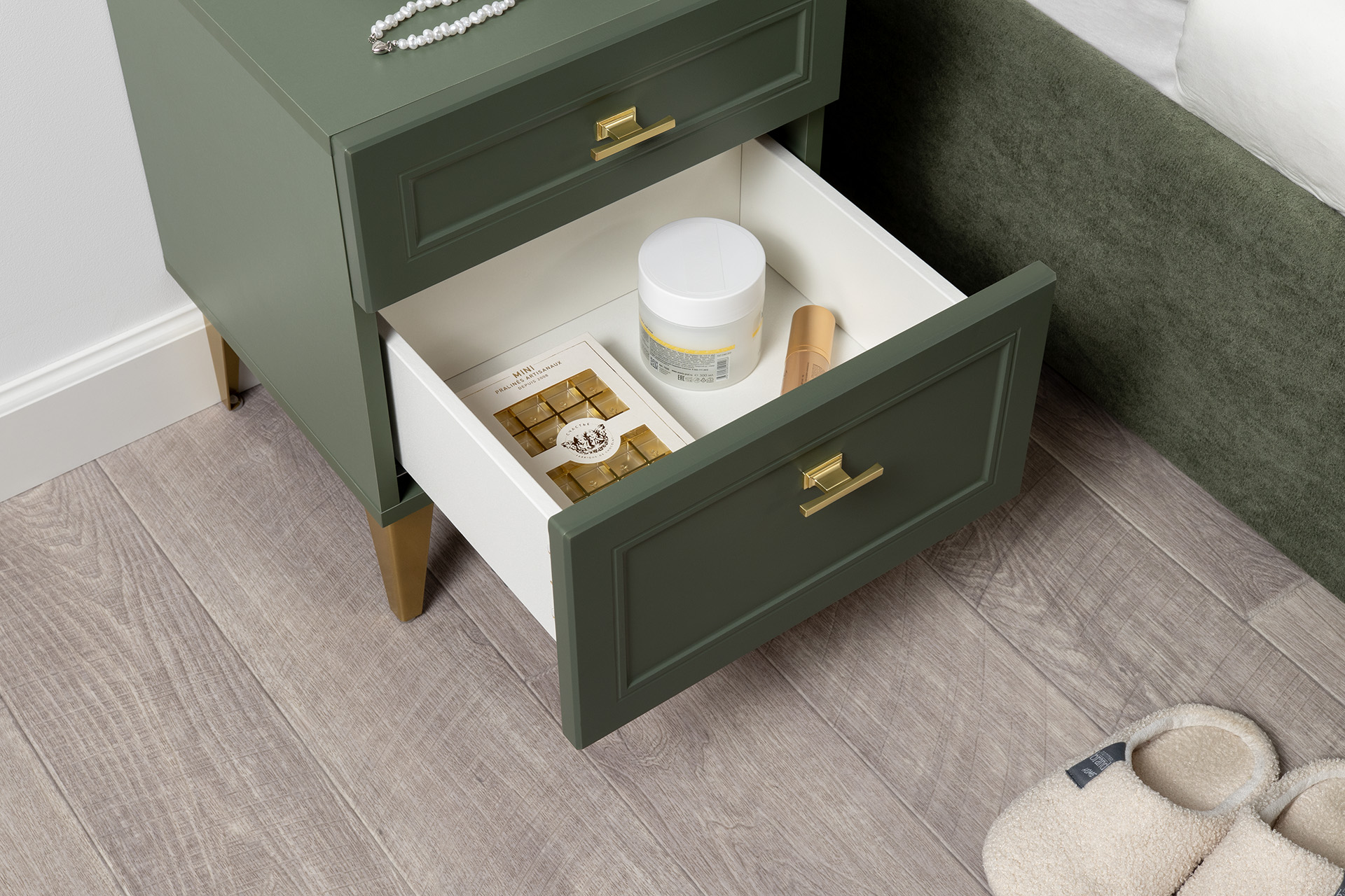 Тумба прикроватная Марион 16.14 дымчатый зеленый K521, олива шагрень AG 1050 ПВХ, белый PE шагрень